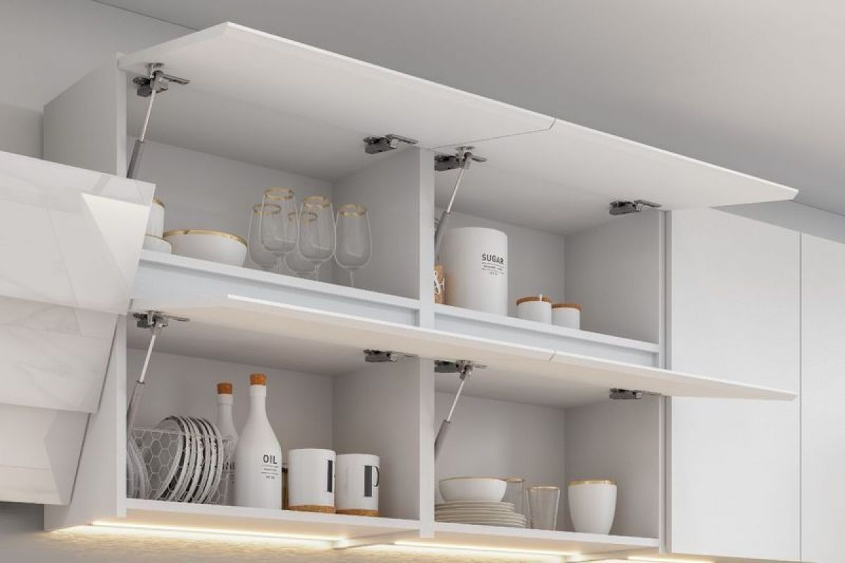 Верхние шкафы состоят из трех модулей — большого шкафа с распашными створками шириной 800 мм и двух шкафов по 600 мм с четырьмя барными створками, открывающимися на газлифтах снизу вверх.