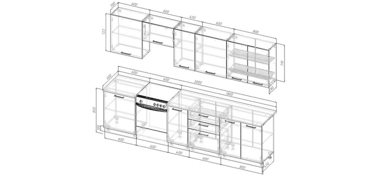 Фасады верхних модулей со свесом 12 мм дают возможность использовать без установки ручек.