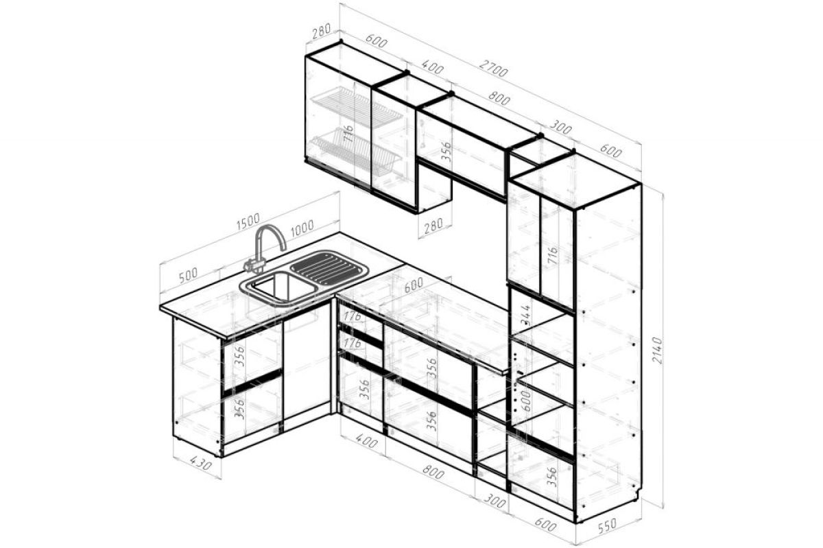 Ширина: 1500*2700 мм; Глубина: 600 мм (со столешницей)