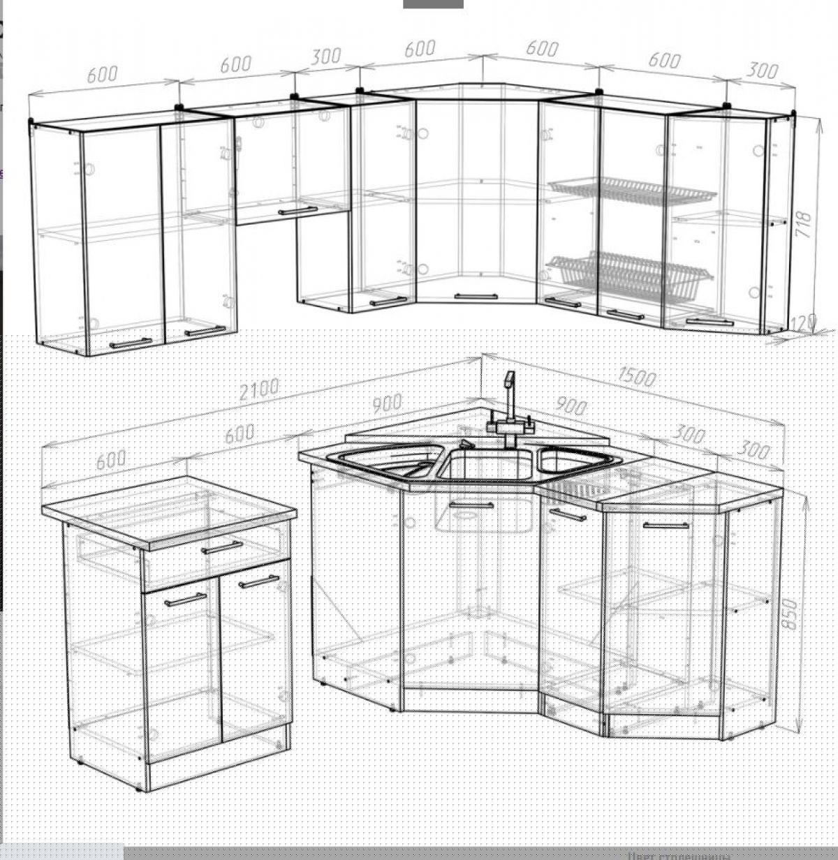 Ширина: 2100*1500 мм; Глубина: 600 мм (со столешницей)