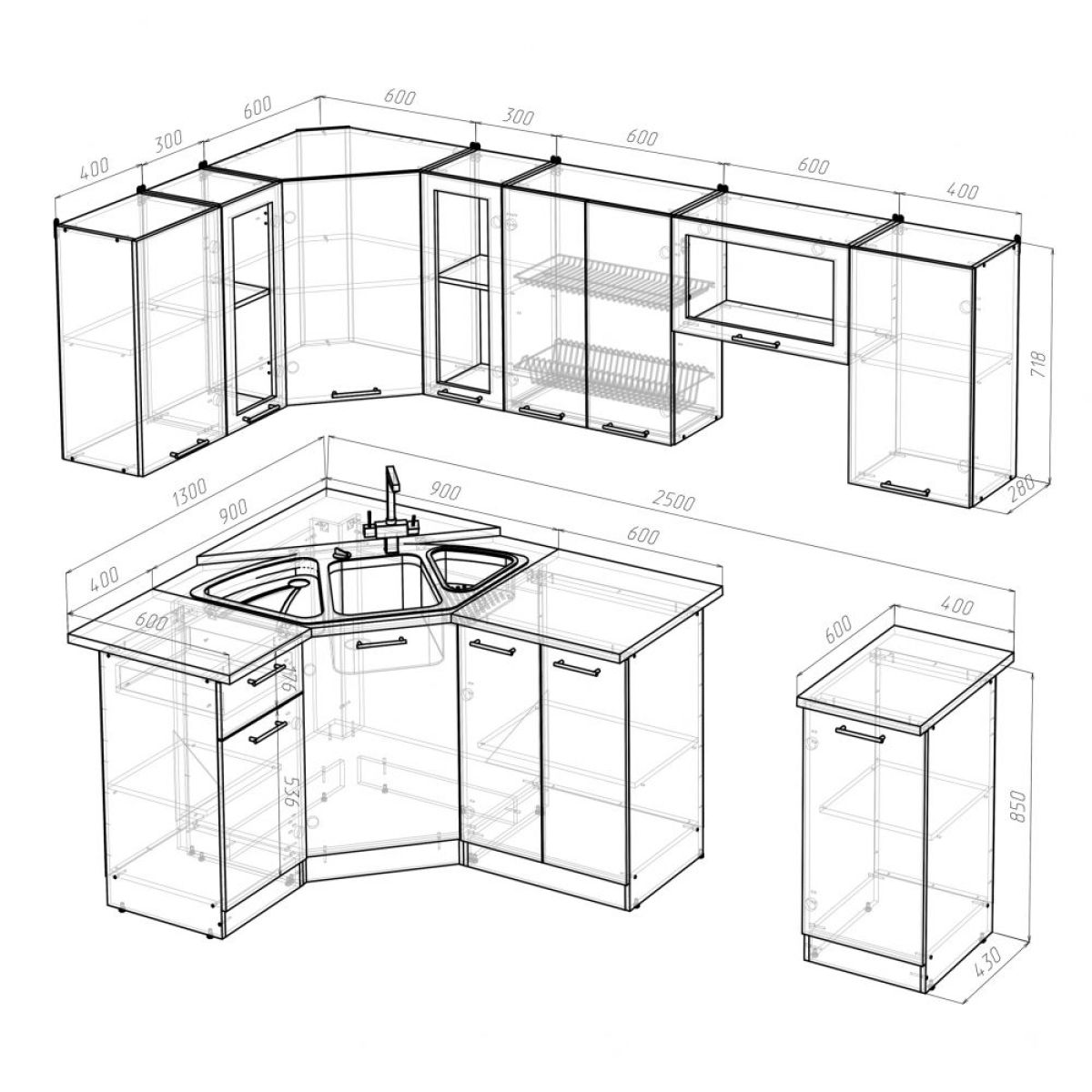 Ширина: 1300*2500 мм; Глубина: 600 мм (со столешницей)