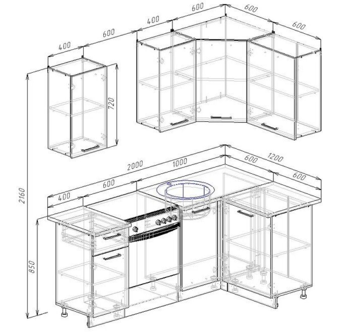 - Фасады со свесом – дают возможность использовать верхние модули без установки ручек, а также установить скрытую подсветку
