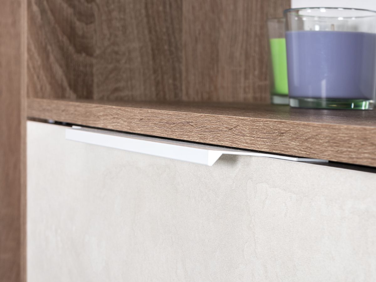 Декор натуральная древесная фактура и "шелковый камень" приятный на ощупь, напоминает ткань. Дизайнерские ручки из металла с белым глянцевым покрытием.