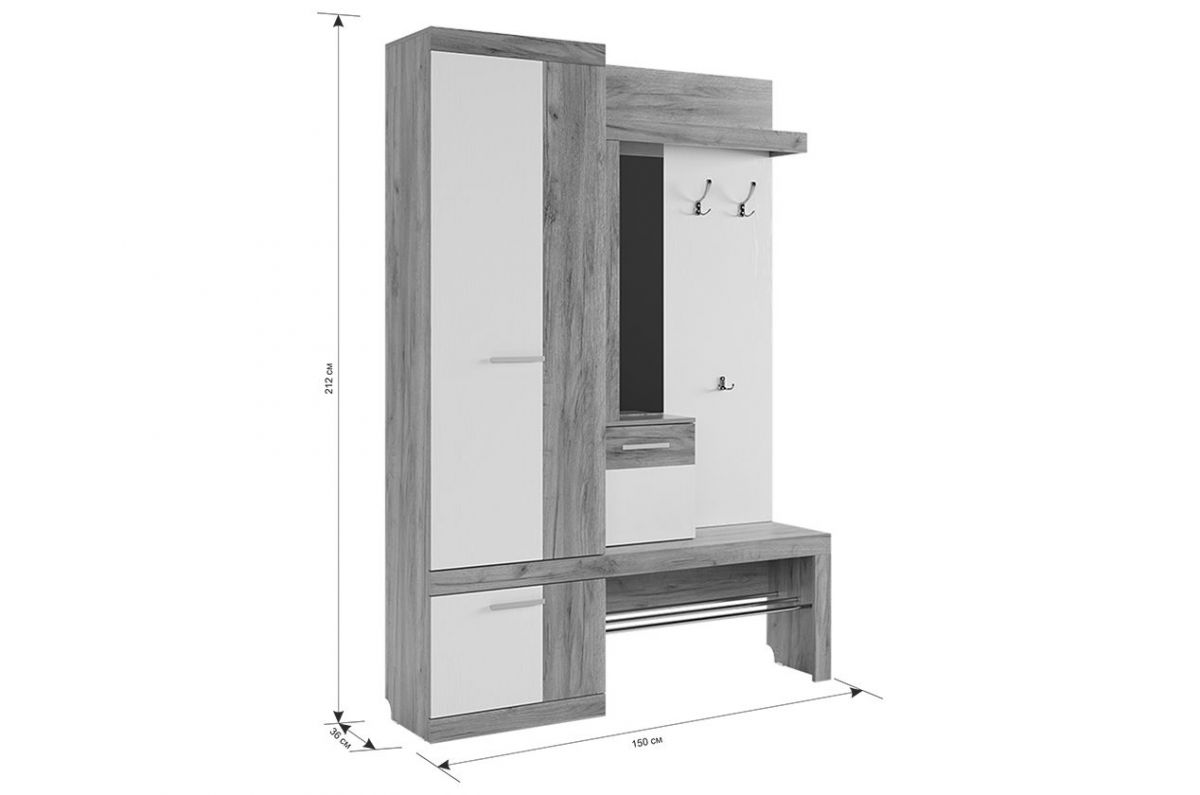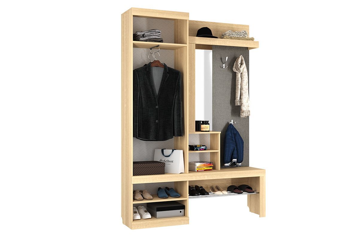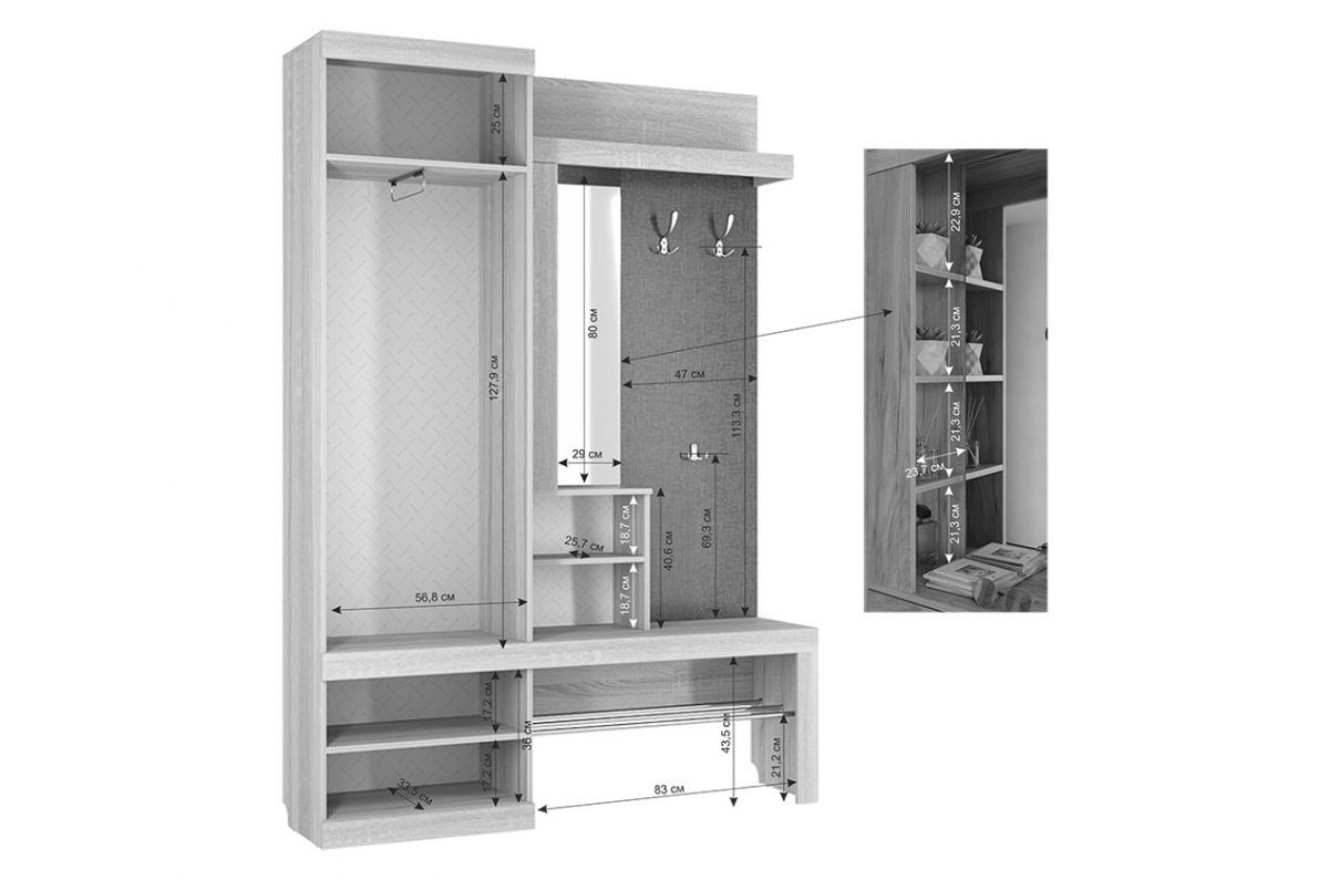 Состоит из: крючки для одежды, обувницы, открытой ниши для обуви, открытых полок, зеркала, полки для головных уборов, шкафа для одежды.