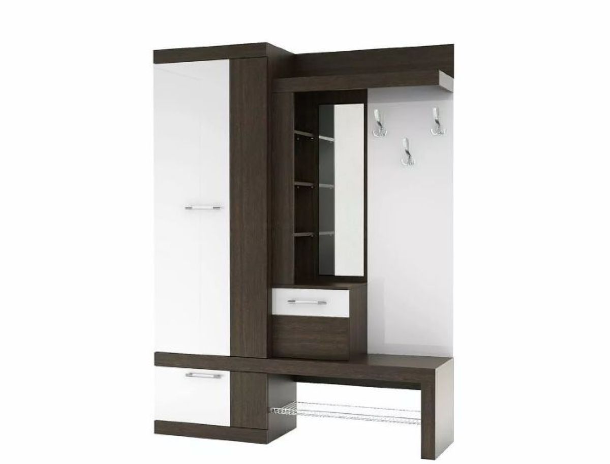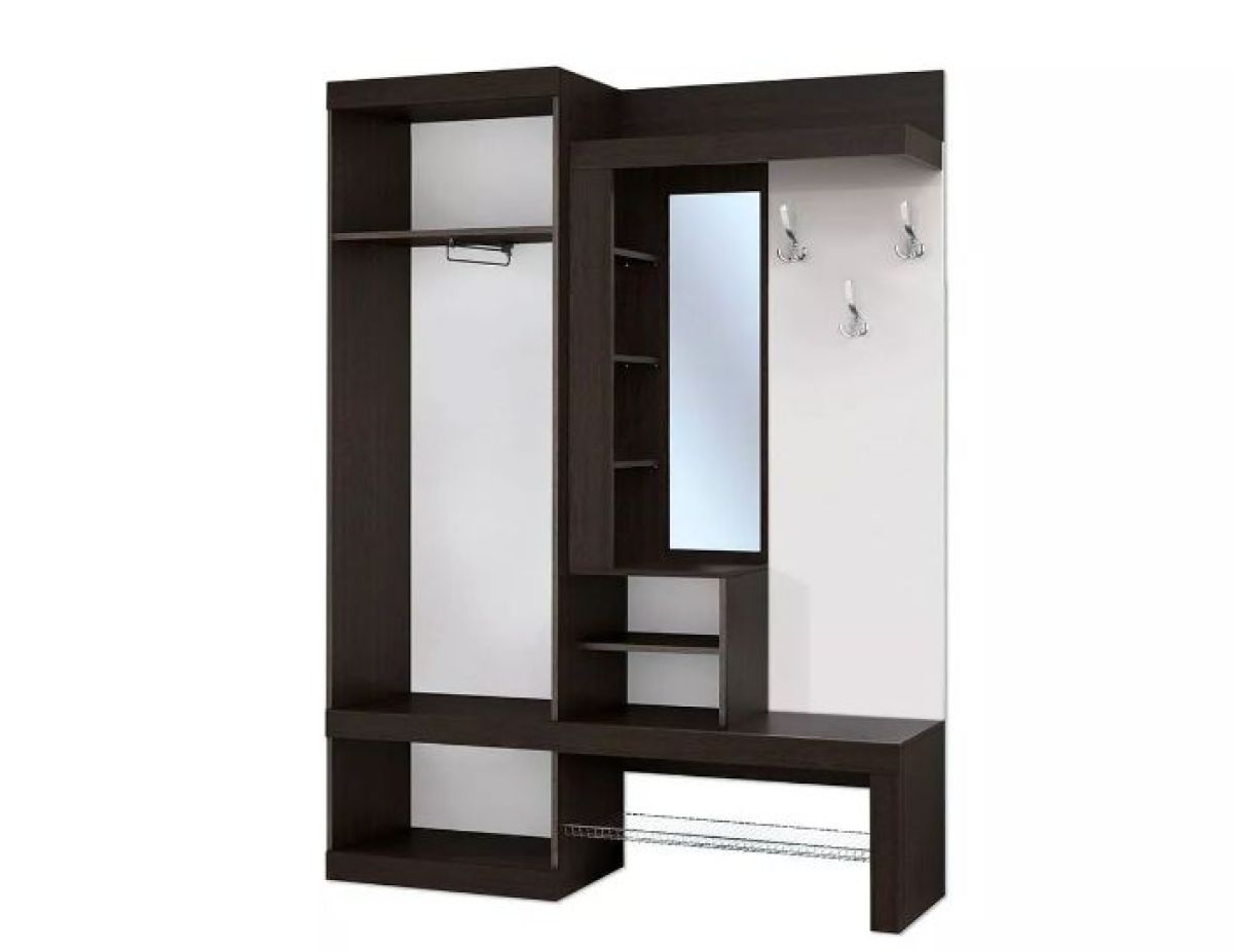 Функциональная прихожая "Дуэт" выполнена в эффектном сочетании цветов. Прихожая включает в себя шкаф с выдвижной штангой, зеркало, трехрожковые крючки для одежды, полки, тумбу под зеркалом и сетчатую решетку для обуви.