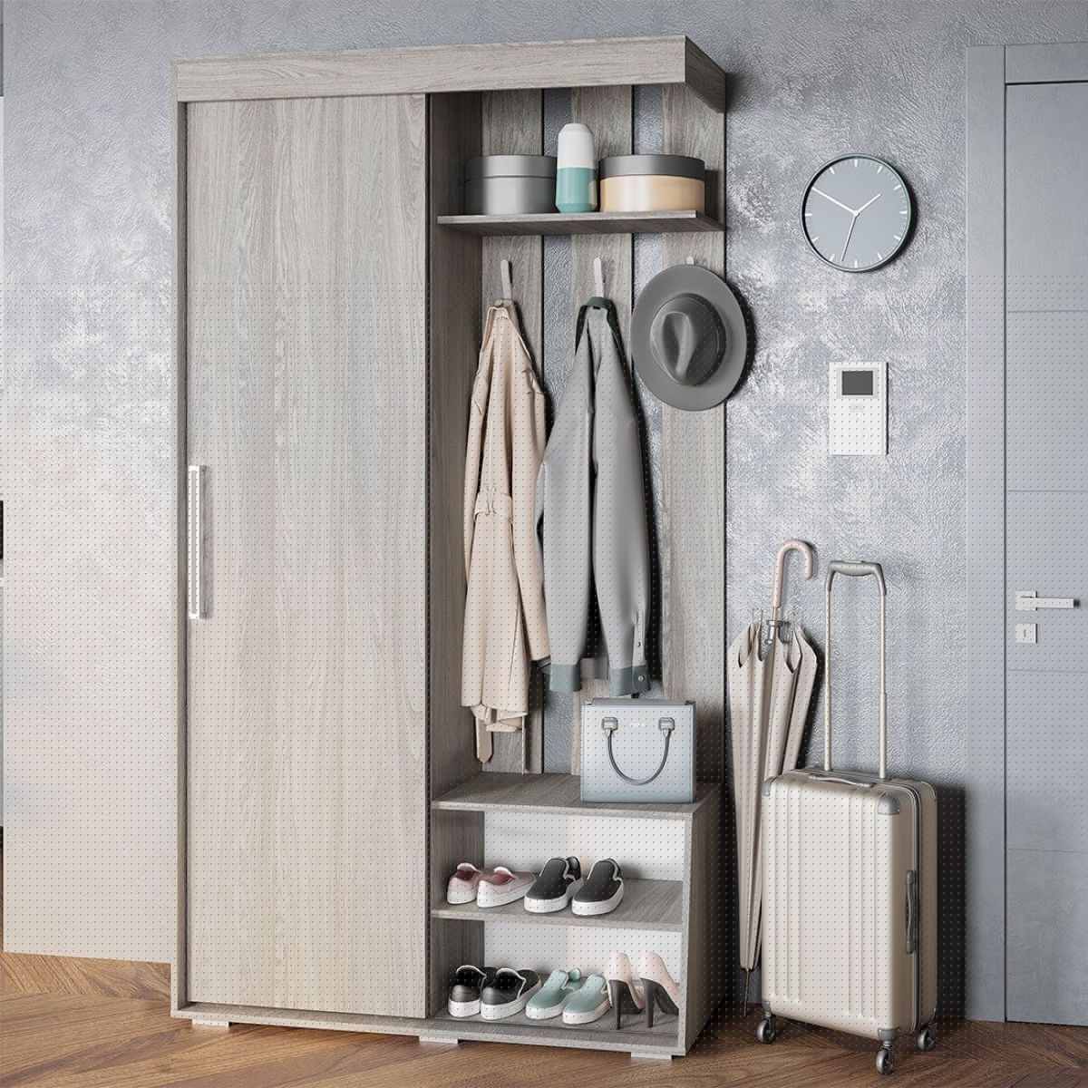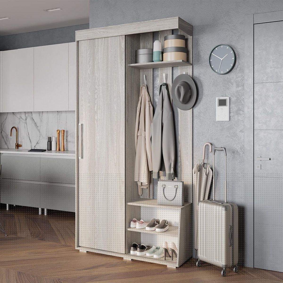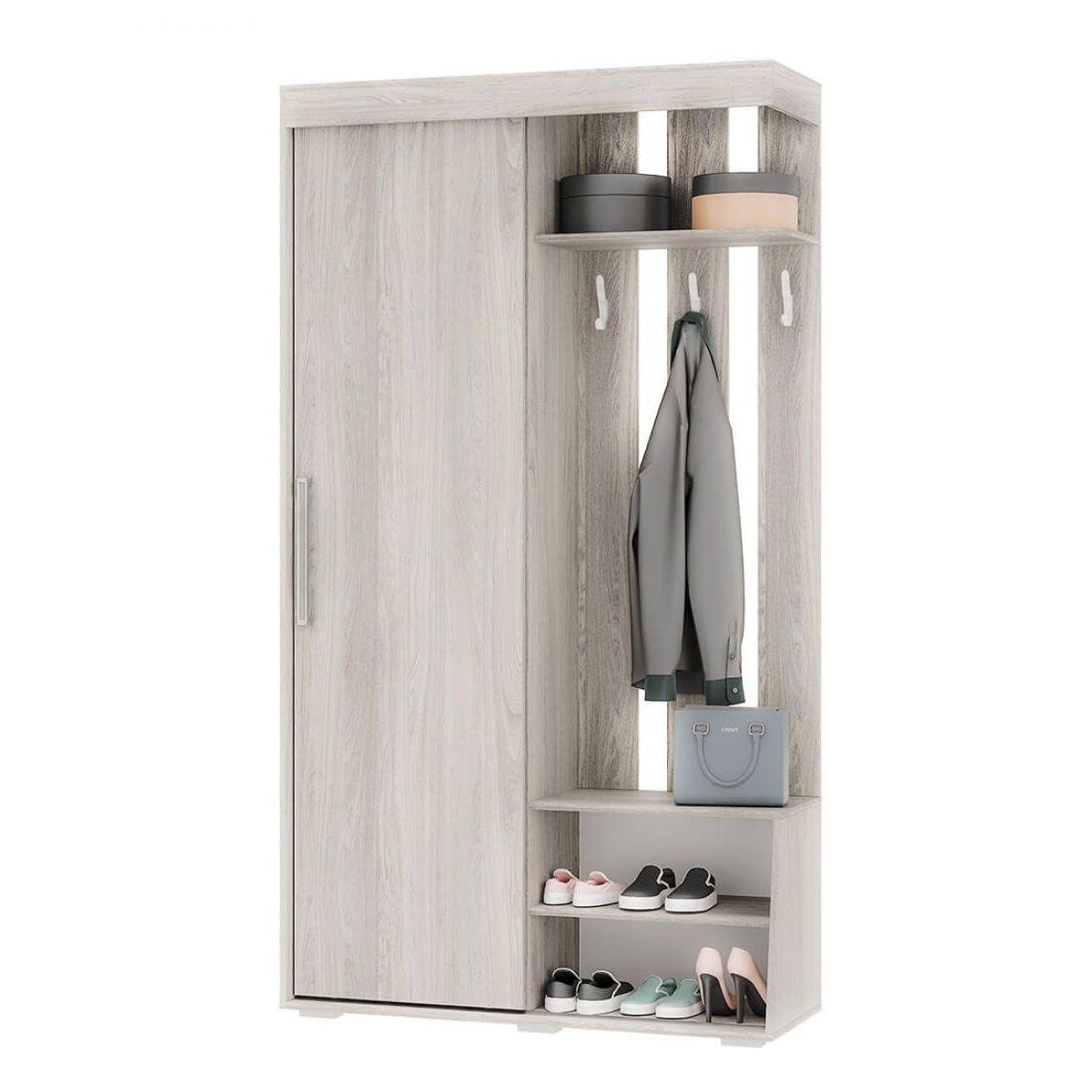 Современная прихожая «Зара», выполненная в спокойном цвете древесной фактуры ясень светлый, может гармонично вписаться в любой интерьер. Несмотря на свою компактность, прихожая имеет просторный шкаф с выдвижной штангой, антресольную полку для головных уборов, две открытых полки для обуви и удобные крючки для верхней одежды.