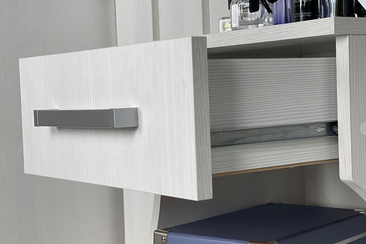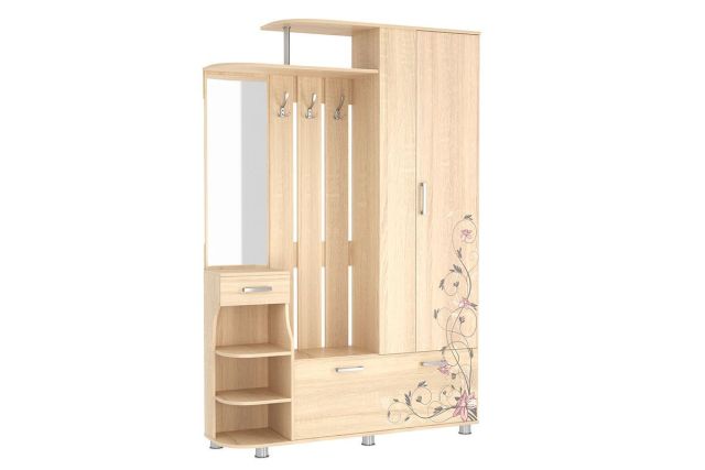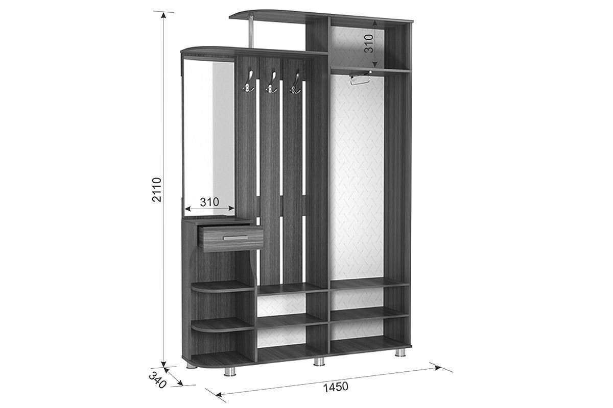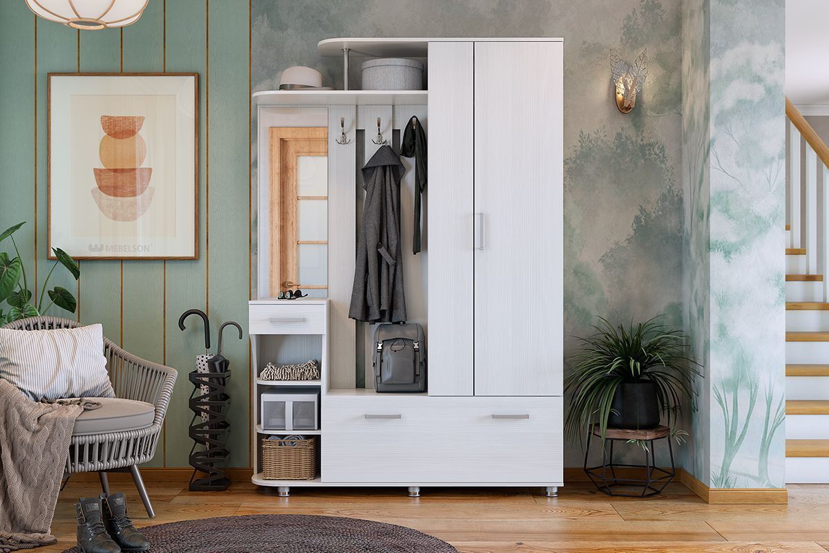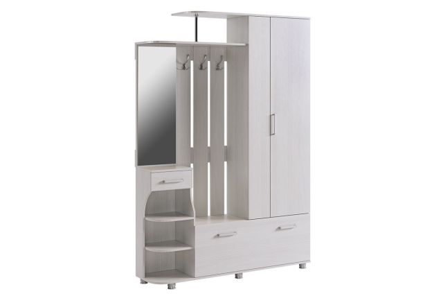 Состоит из: шкафа с выдвижной штангой, вешалки с крючками для одежды и сумок, обувницы, открытых полок, зеркала, полки для головных уборов, выдвижного ящика. Сборка универсальная, рисунок на фасадах не универсальный. На прихожей в цвете белый рамух нет рисунка.