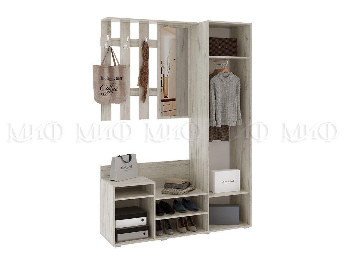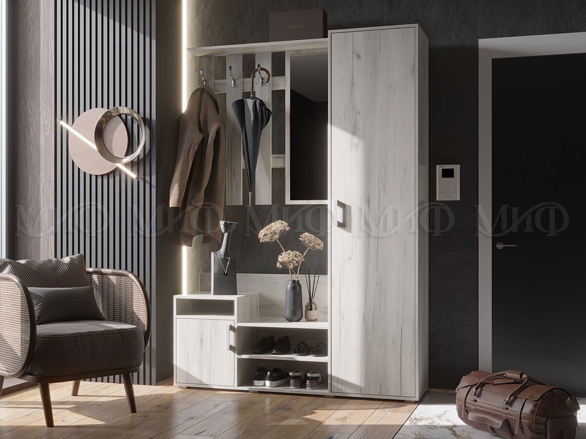 Прихожая компактна, занимает немного места. Прихожая содержит все элементы, необходимые для создания комфорта во входной зоне.