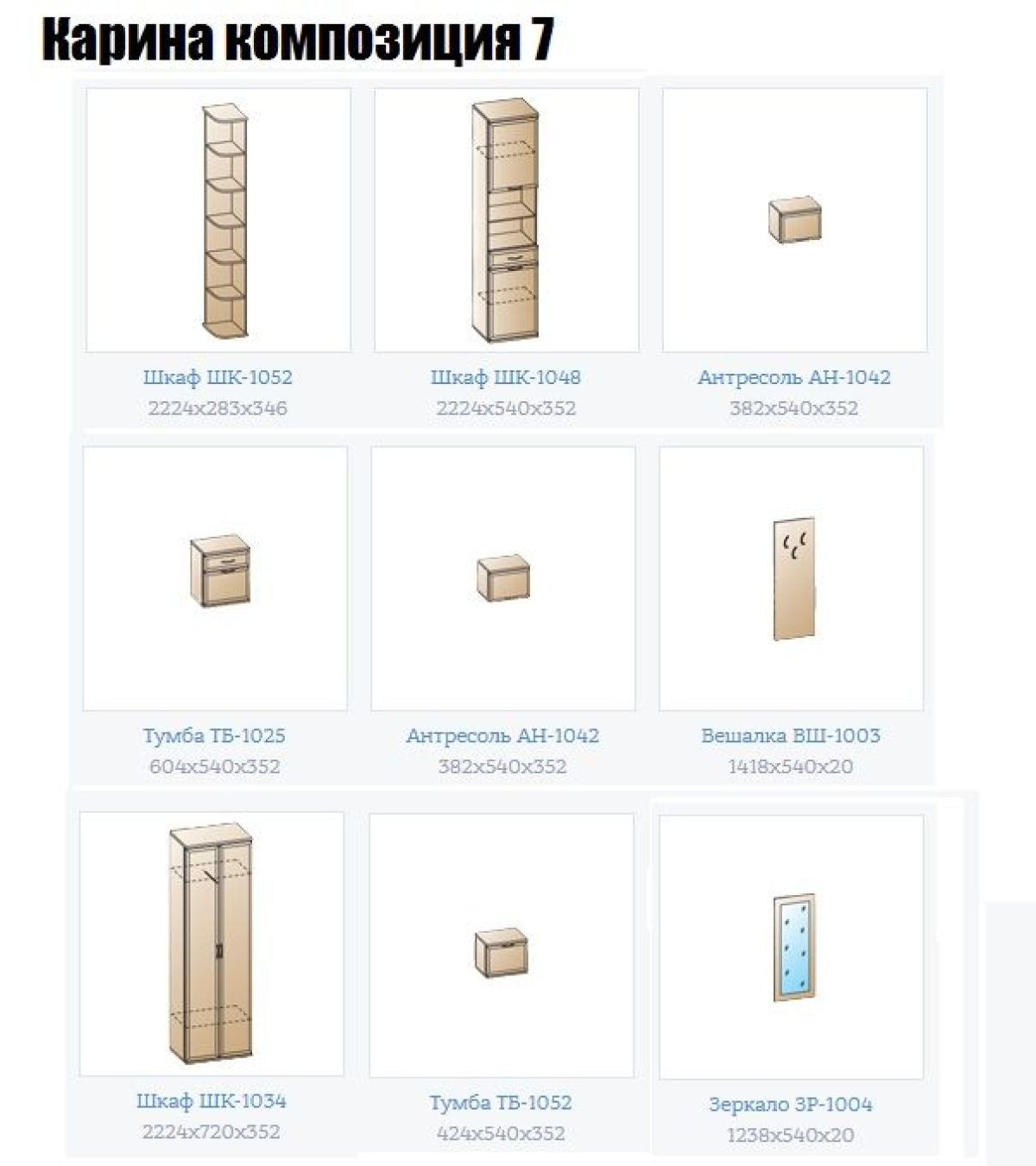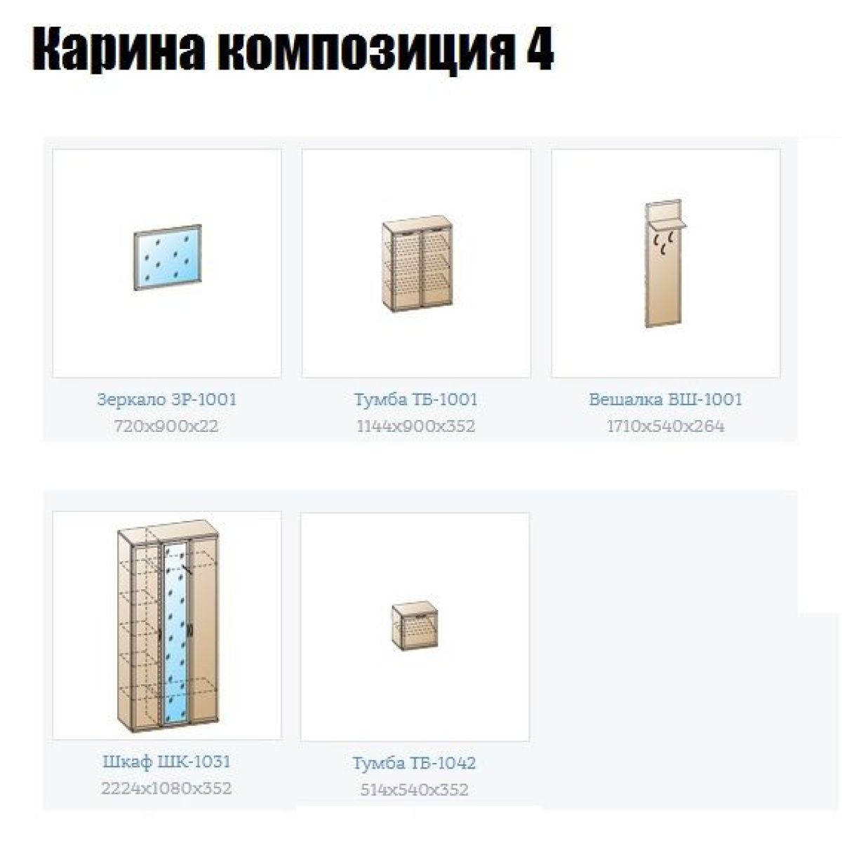 Коллекция включает в себя 38 оригинальных модулей, созданная с их помощью композиция отлично впишется в любое помещение. Программа «Карина» позволит создать уют и гармонию в прихожей.