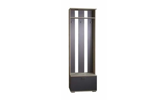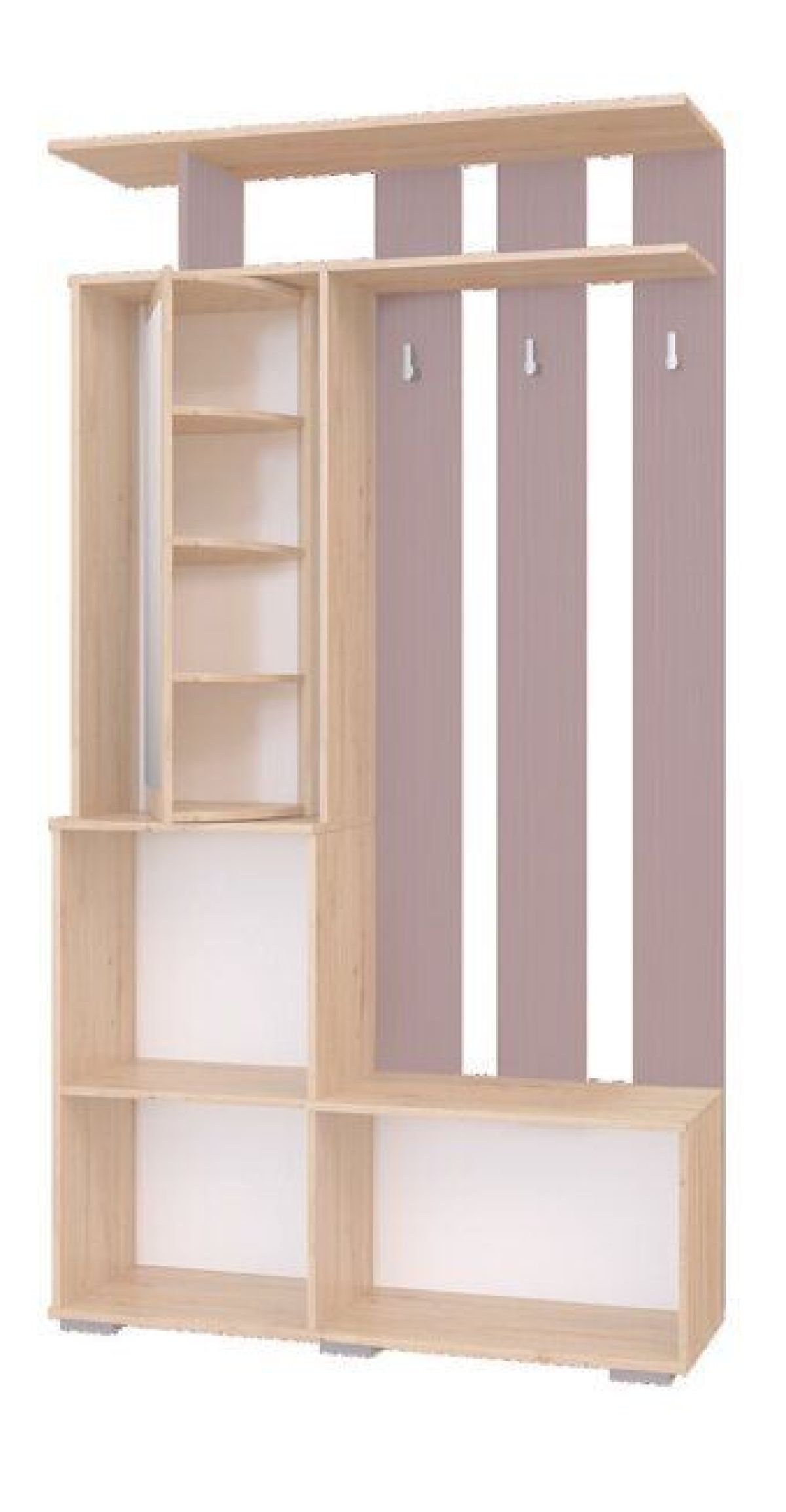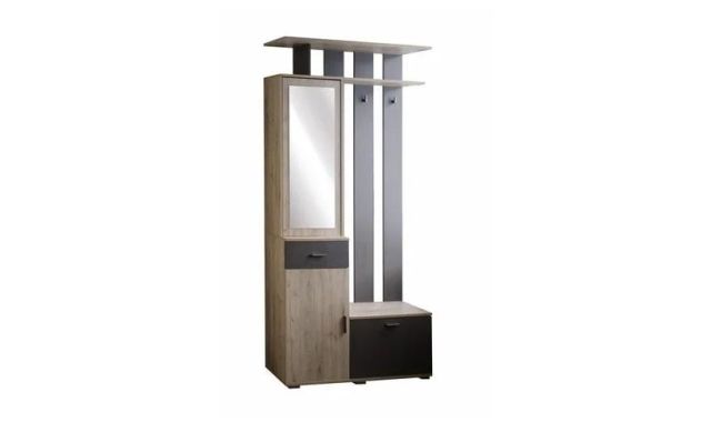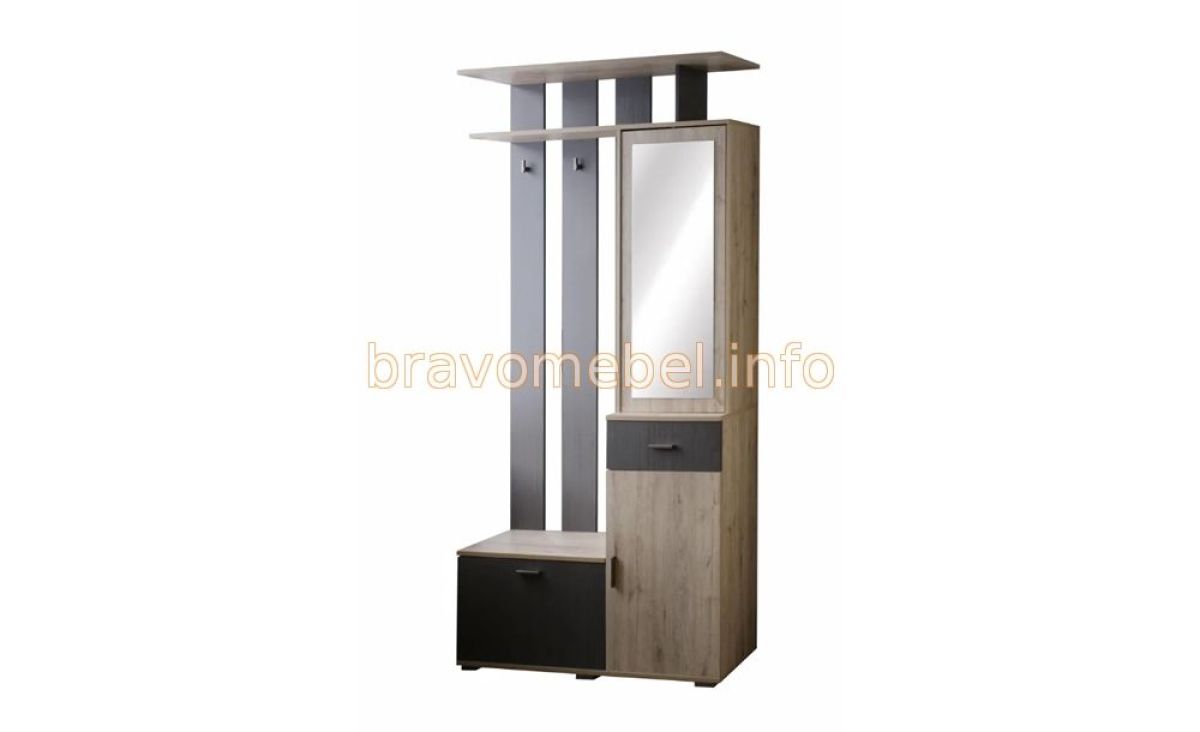 Модуль 1 шкаф: универсальный, собирается на любую сторону. Состоит из 2-х модулей, шкафа и вешалки. Фасад с зеркалом имеет поворотный механизм, к которому прикреплены полки. При повороте зеркало смещается в шкаф, а перед вами остаются полочки.