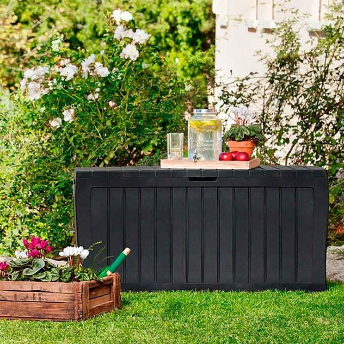 Большой пластиковый сундук с плоской крышкой можно использовать для хранения любых бытовых вещей: подушек, пледов, игрушек, садовых принадлежностей — содержимое сундука остаётся сухим и будет хорошо вентилироваться. Дополнительно можно установить на сундук замок, чтобы не бояться за сохранность содержимого. Классический дизайн и универсальная форма позволяют гармонично вписаться сундуку в окружающий ландшафт!