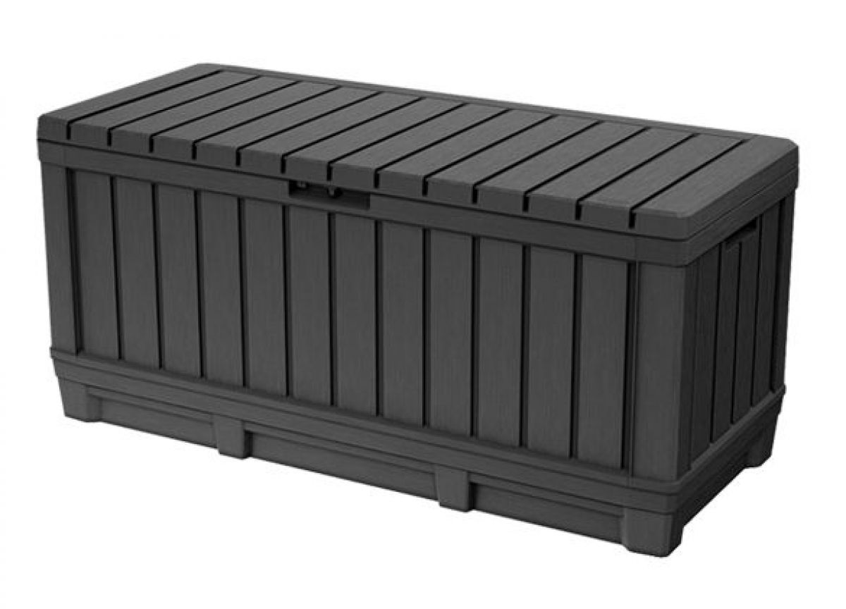 Сундук Кенвуд ёмкостью 350 литров сочетает привлекательный вид с практичными достоинствами, благодаря отделке под натуральное дерево он прекрасно вписывается в окружение любого сада, террасы или патио. Ящик изготовлен из пластика, защищенного от действия ультрафиолетовых лучей, поэтому он сохраняет привлекательный вид, несмотря на неблагоприятные погодные условия, действие солнца и т.п. Уход банально прост: достаточно время от времени протирать ящик.