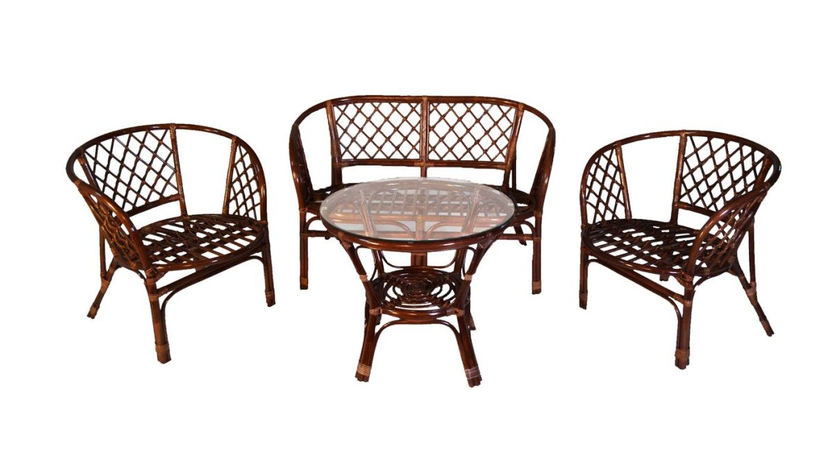 Комплект из натурального ротанга, состоящий из дивана, двух кресел и круглого столика со стеклом.
