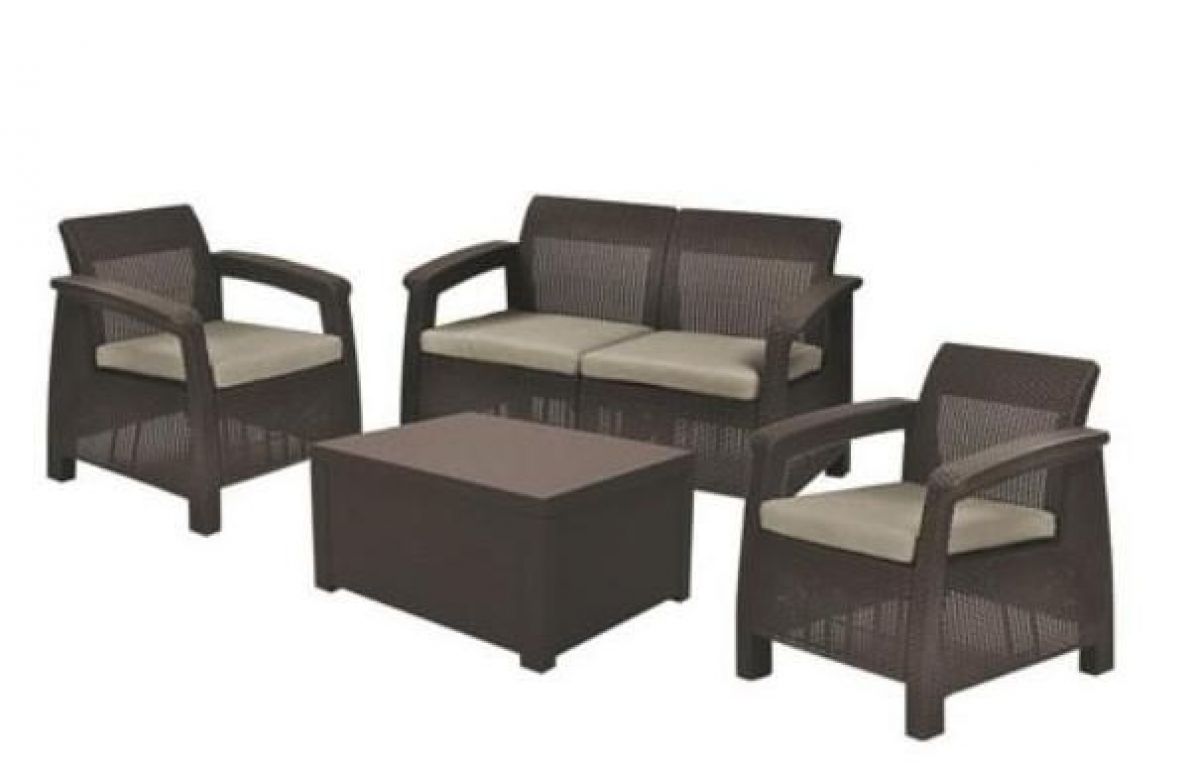 Corfu box - это элегантный мебельный гарнитур с фактурой, напоминающей ротанг, который состоит из двух кресел, двухместного дивана и столика-сундука. Продукт оснащён мягкими подушками сидений. В столе-сундуке всегда можно спрятать вещи от дождя. Мебель с легкой и одновременно устойчивой конструкцией красиво впишется в любое приусадебное пространство, такое как сад или терраса. Набор очень легко чистится. Изготовлен из стойкого к воздействию УФ-излучения пластмассы.