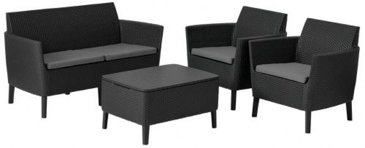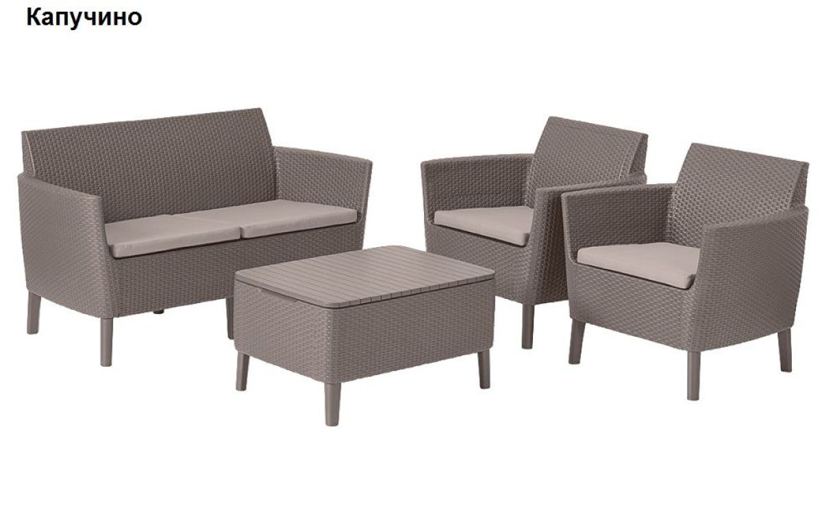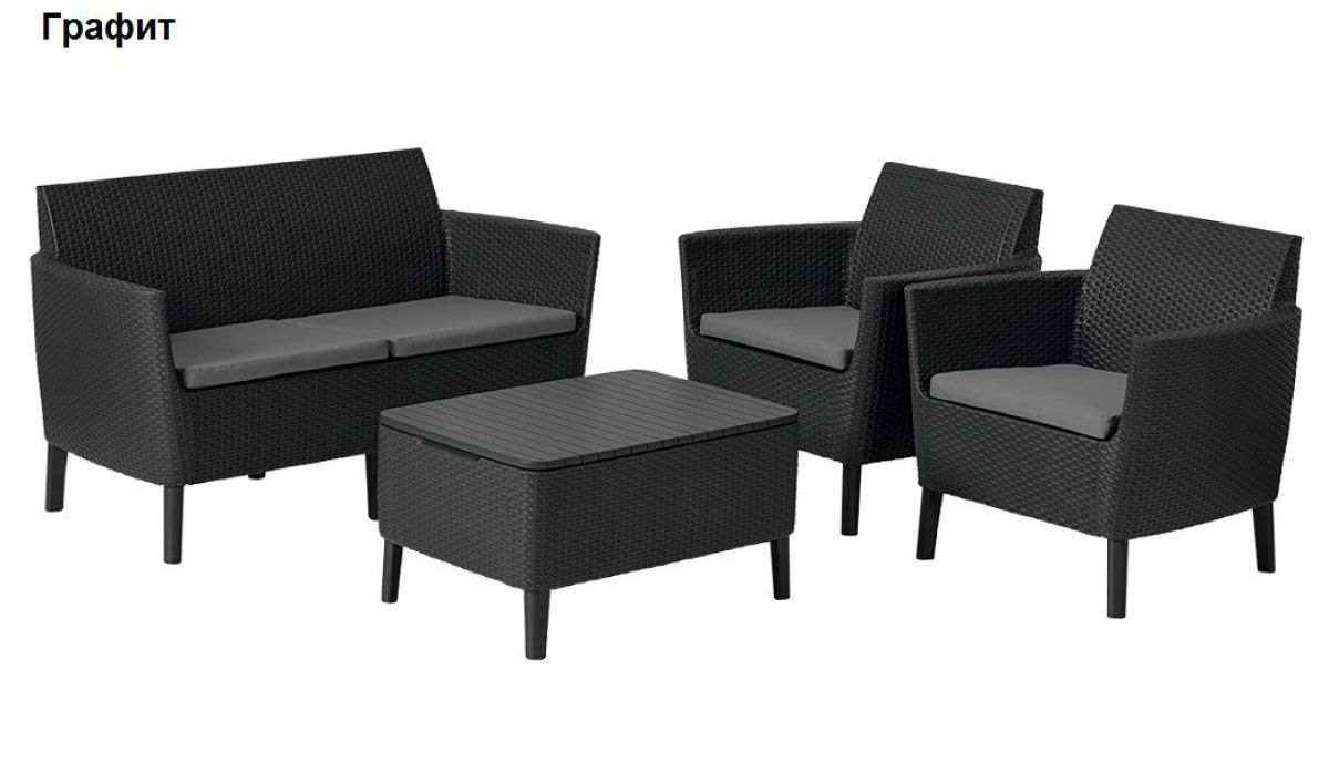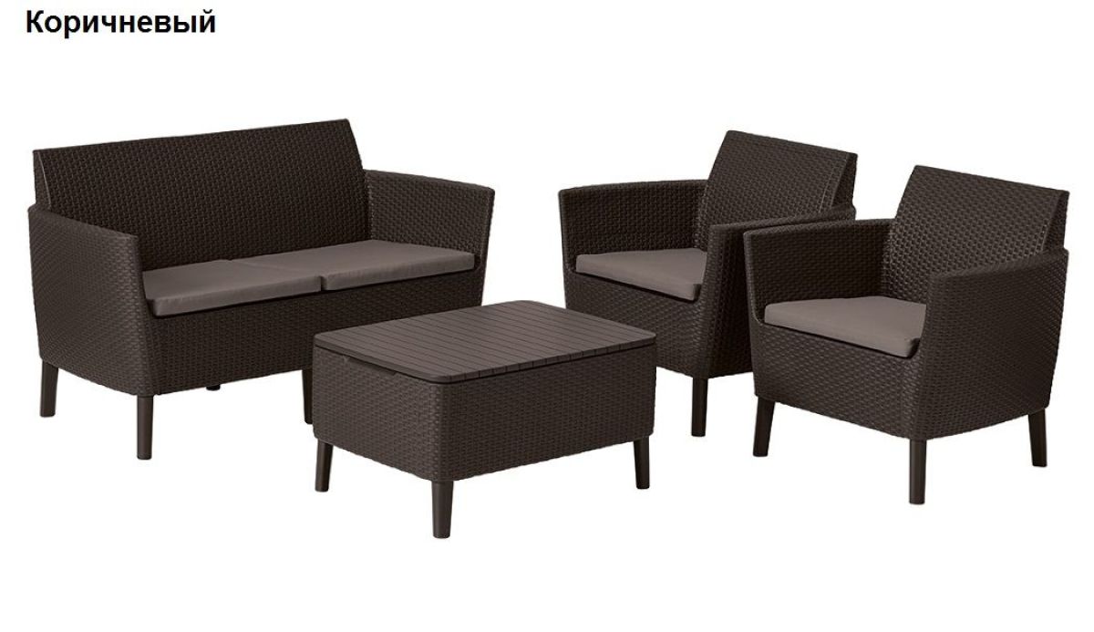 Комплект имеет красивые округлые линии и современный вид. На нем с полным комфортом могут расположиться четыре человека. Комплектация: 2-местный диван, два кресла, подушки на сиденья, столик с отделением для хранения небольших вещей.