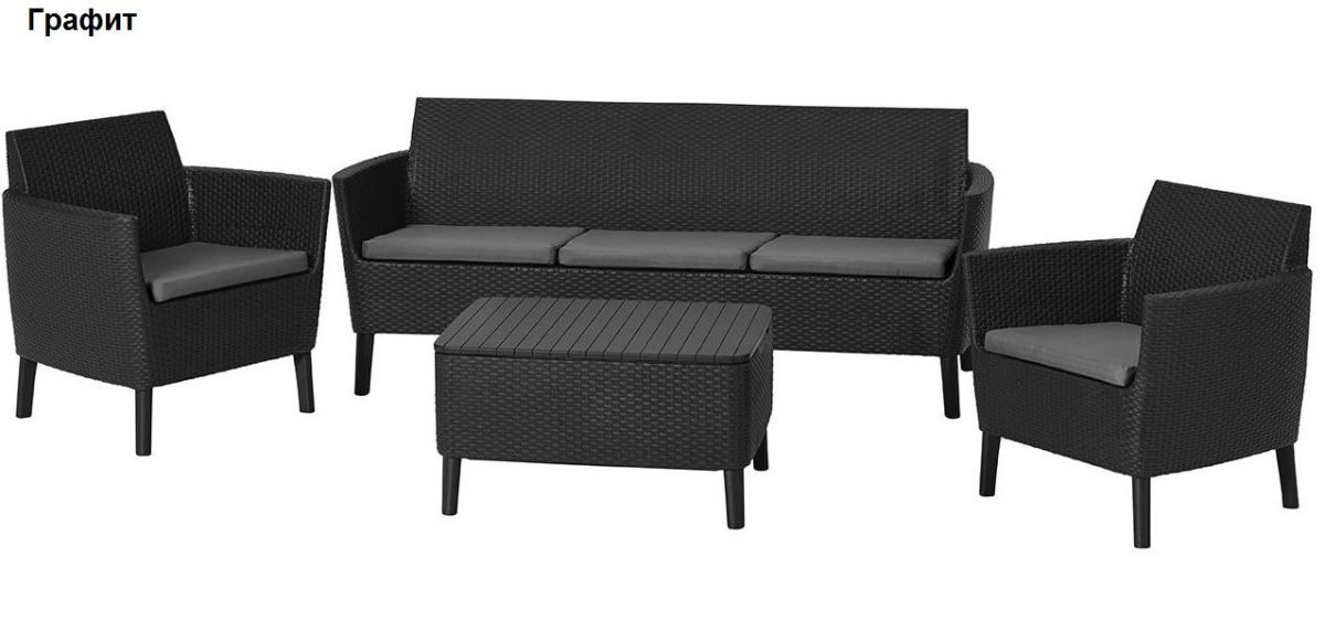 Комплект имеет красивые округлые линии и современный вид. На нем с полным комфортом могут расположиться пять человек. Комплектация: 3-местный диван, два кресла, подушки на сиденья, столик с отделением для хранения небольших вещей.