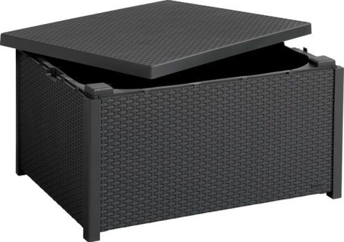 • Стол-сундук Арика - решение двух проблем одновременно: достаточно большой кофейный столик является еще и коробом для хранения подушек или любых других предметов. Стол выполнен из пластика, имитирующего искусственный ротанг, поэтому он отлично подойдет к любому комплекту мебели KETER с одинарным плетением, например, комплектам Корфу.
