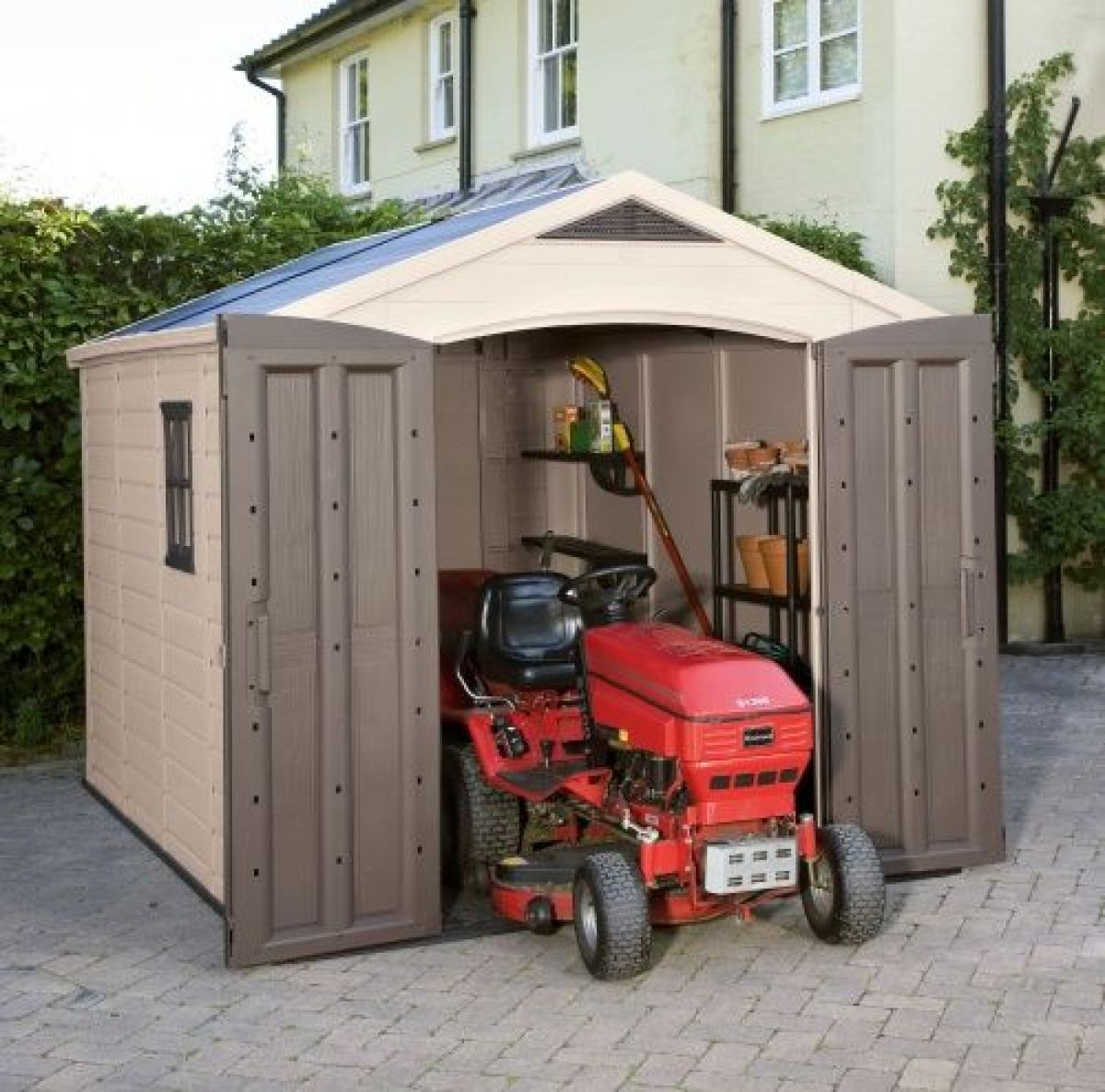 Функциональный домик Factor 8x6 будет радовать даже самых требовательных пользователей. Стальная усиленная конструкция, широкие двустворчатые двери, дополнительное освещение через встроенное окно - это несомненные преимущества этого продукта. Пространство домика можно организовать наиболее оптимальным способом, благодаря возможности установки полок и вешалок. Изготовлен из высококачественного пластика, не требует технического обслуживания, не подвержен процессам коррозии, отслаивания покрытия или гниения материала.