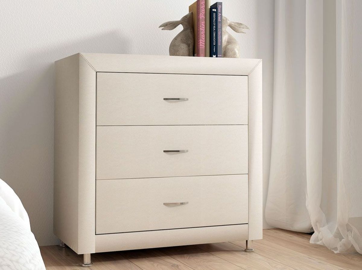 • Элегантный комод отличается стильным дизайном и повышенным удобством. Три выдвижных ящика оснащены надёжными направляющими, обеспечивающими лёгкое открытие. Фасад ящиков и стенки комода покрыты обивочным материалом. Для удобства использования и продления срока эксплуатации, рекомендуется использовать стеклянную накладку. Накладка используется в качестве столешницы для комода и защищает его от повреждений и загрязнений. Комод 3 ящика вы можете купить в интернет-магазине Madimart.ru по цене 33 050 руб. Только качественная мебель от Российских брендов. Если у вас возникли вопросы или вам нужна консультация по наличию, срокам доставки, ценам, обращайтесь любым удобным способом.