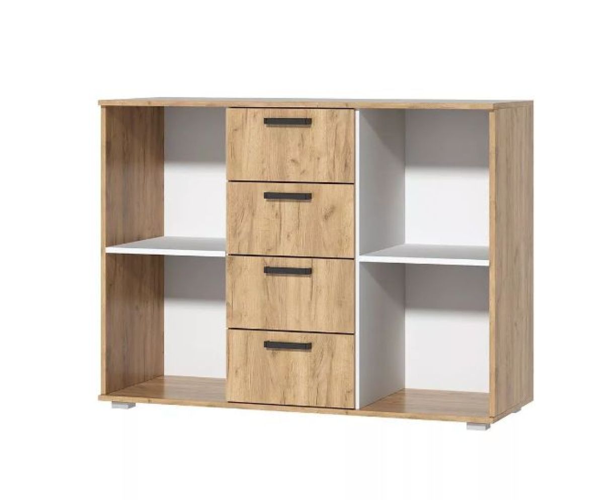 Комод имеет 4 выдвижных ящика в центре и 2 боковых отделения с полкой за распашной дверцей. Функциональный комод может служить подставкой под декор, косметику и местом хранения разнообразных вещей.
