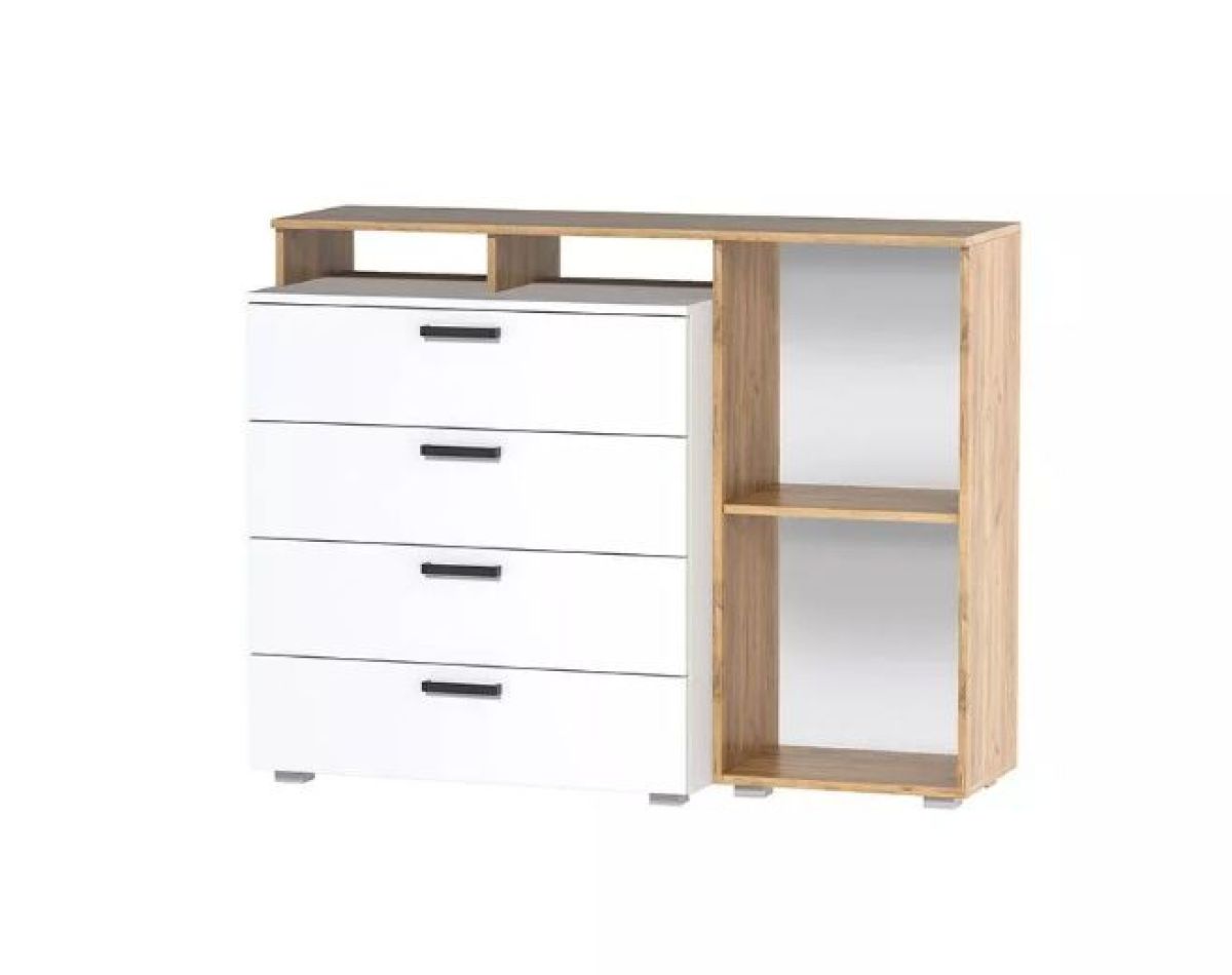 Комод имеет 4 вместительных ящика, отделение с полкой за распашной дверцей, открытые ниши. Функциональный комод может служить подставкой под декор, косметику и местом хранения разнообразных вещей.