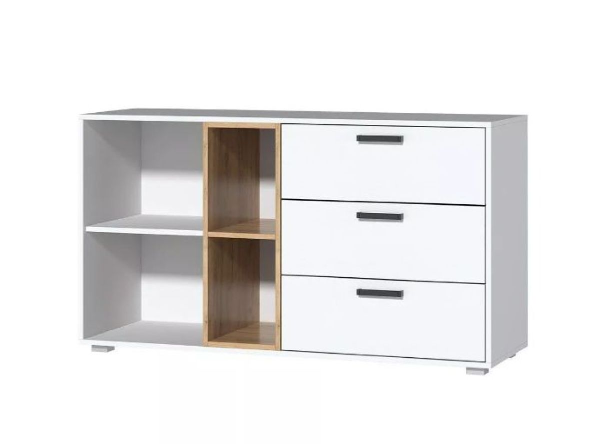 Комод имеет 3 выдвижных ящика, отделение с полкой за распашной дверцей, открытые ниши. Функциональный комод может служить подставкой под декор, косметику и местом хранения разнообразных вещей.