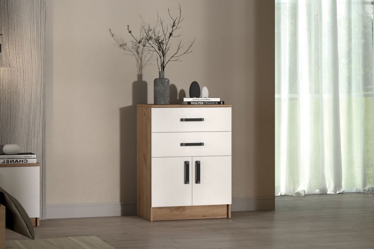 Классический, контрастный комод включает в себя два выдвижных ящика и вместительное отделение за двумя распашными дверцами.