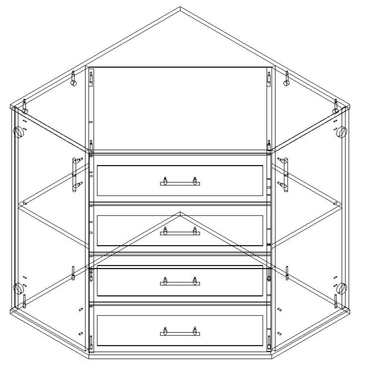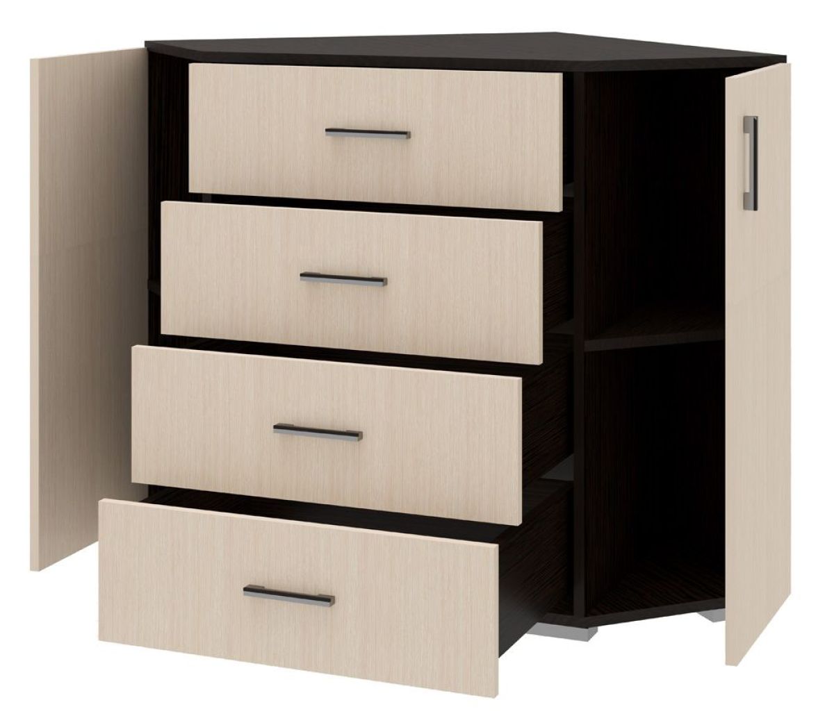 Комод угловой 2-створчатый комбинированный для хранения белья с 4-мя выдвижными ящиками на роликовых направляющих.