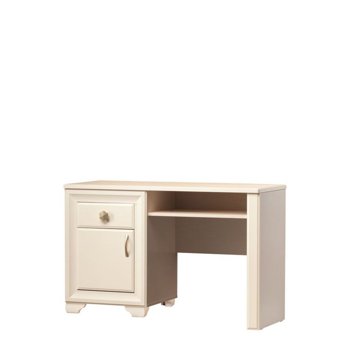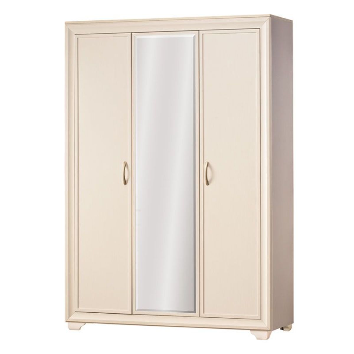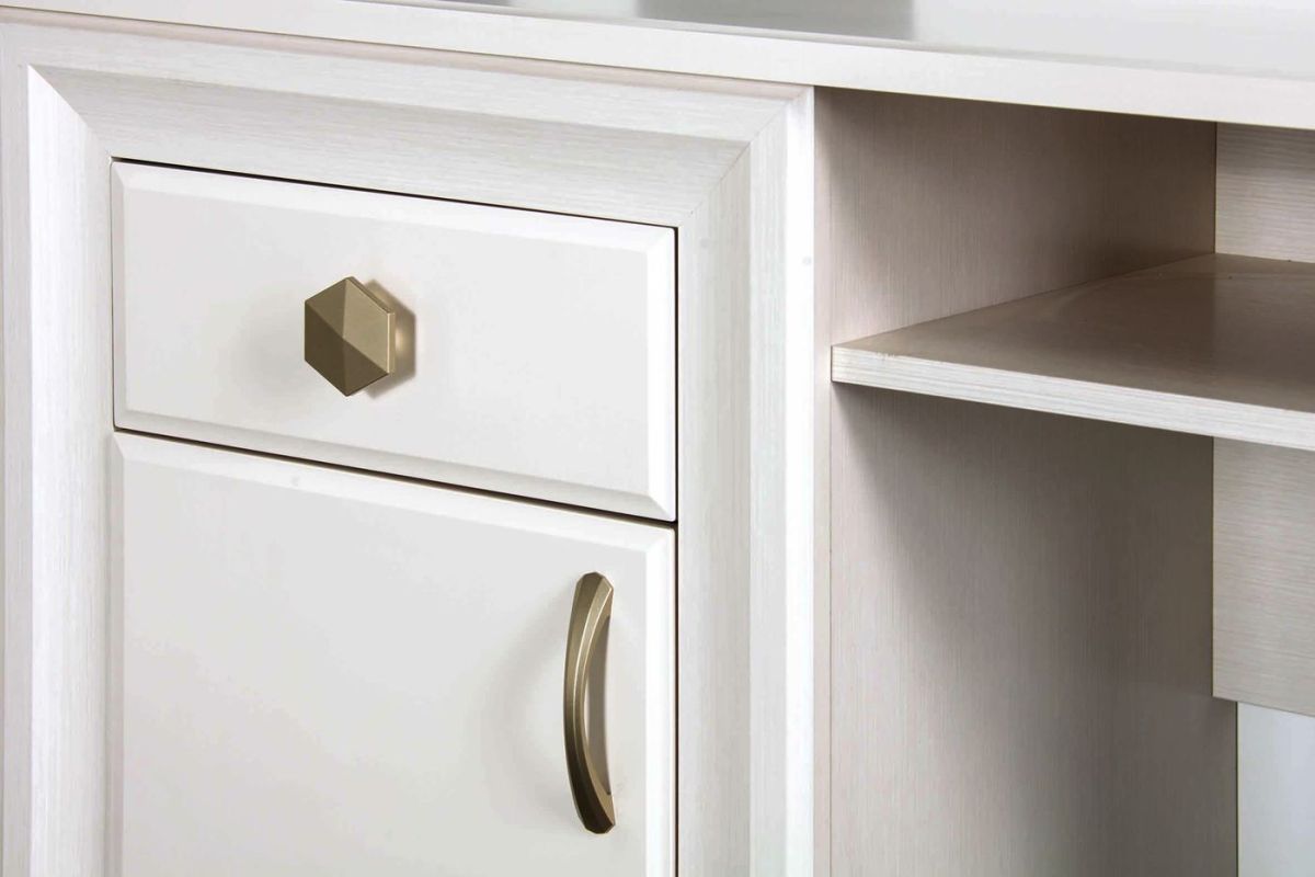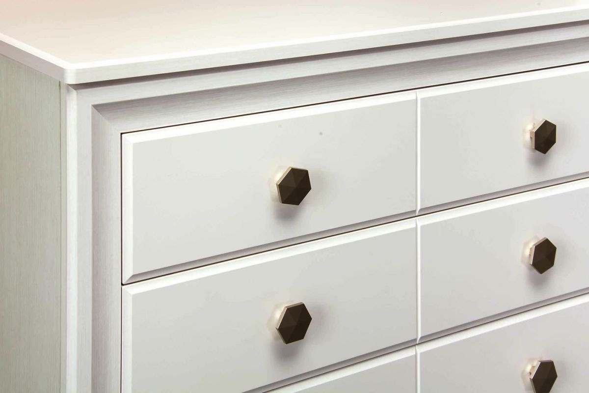 «кремовый белый», который уже успел полюбиться клиентам фабрики по серии «Марлен», но отличается более современным дизайном. В нем отсутствуют замысловатые декоративные элементы и колонны, на первый план выходят прямые линии. Украшением комплекта служат оригинальные итальянские ручки золотистого цвета. В оформлении фасадов комода сделан необычный ход. Некоторые линии, делящие ящики на, казалось бы, самостоятельные отсеки, на самом деле являются фрезеровкой. Кровать оснащена мягким тканевым изголовьем, что является сейчас безусловным трендом.