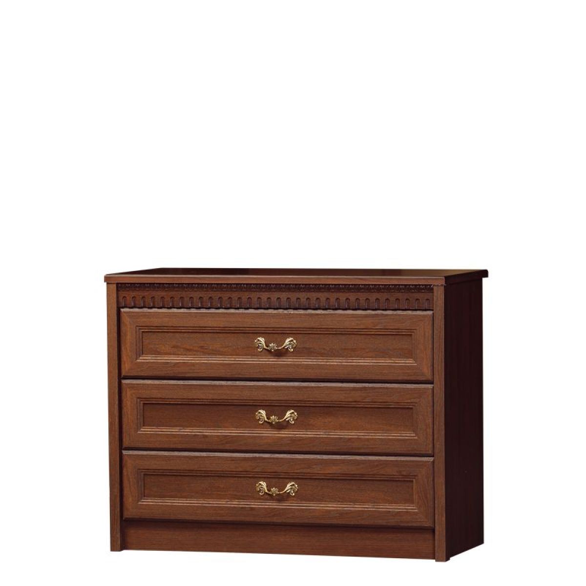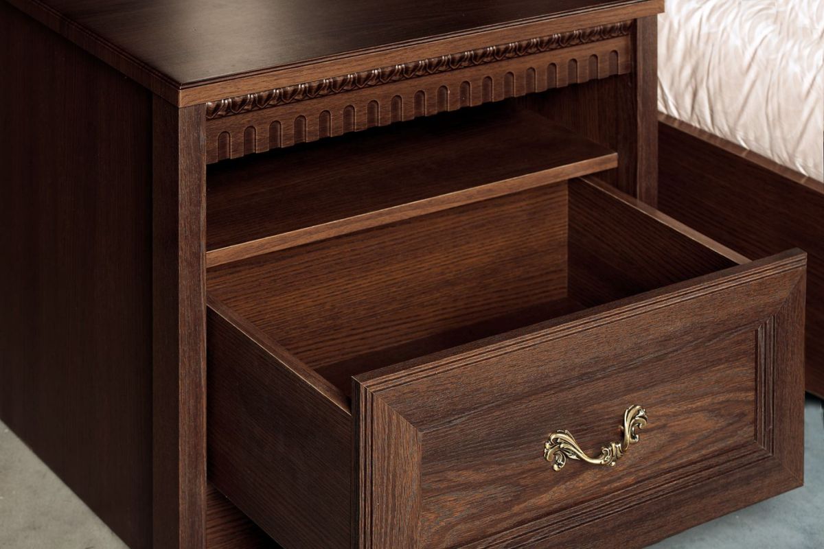 Мебель оснащена надежной немецкой фурнитурой «Hettich, во всех модулях серии «Лючия» устанавлена одинаковая лицевая фурнитура под состаренное золото, поэтому шкафы для одежды и тумбы могут быть использованы для обоих помещений