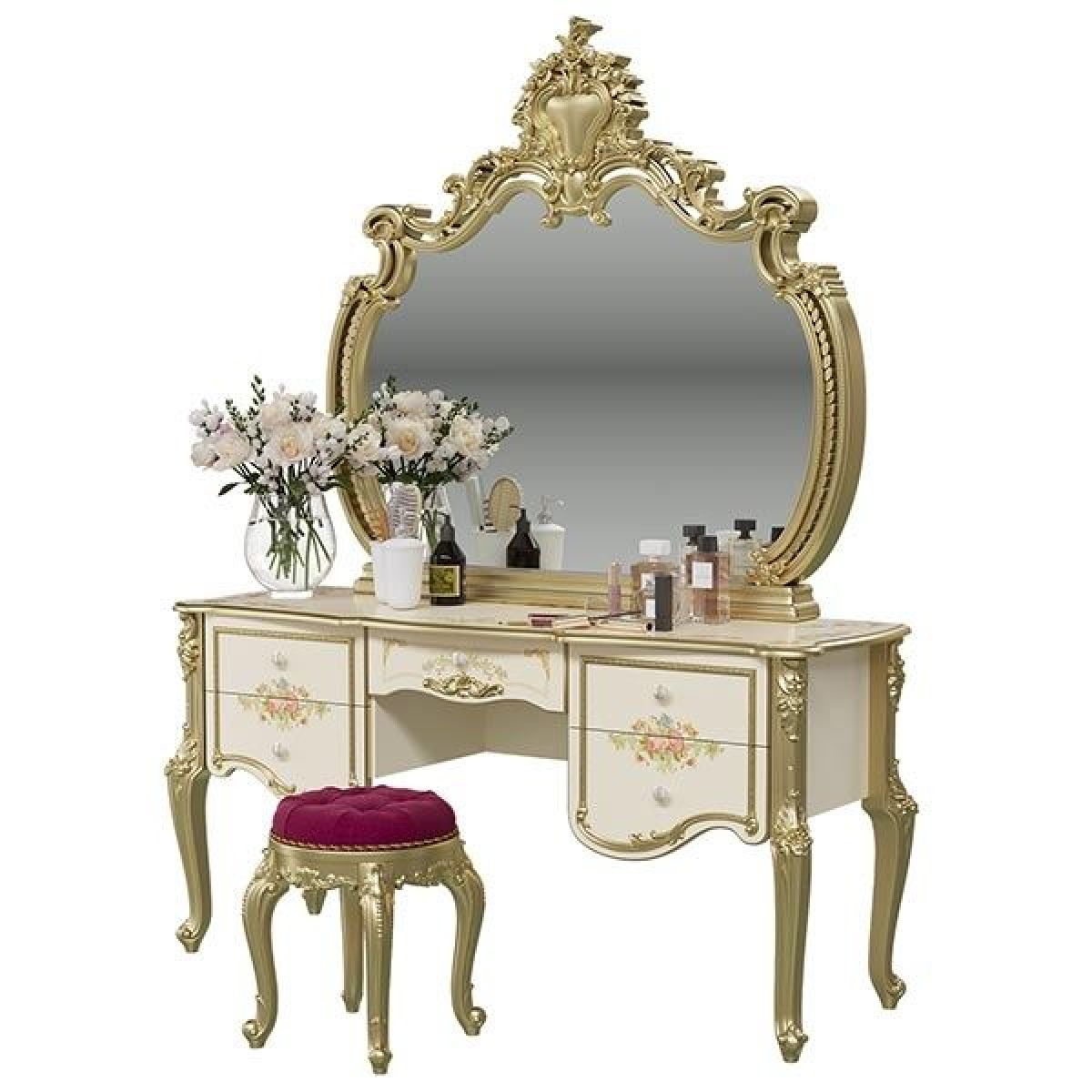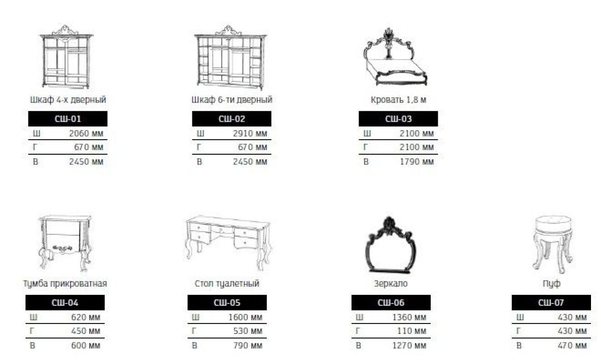 Цена указана за гарнитур как на главном изображении: Кровать, прикроватная тумба 2 шт., Стол туалетный, Зеркало, Пуф.