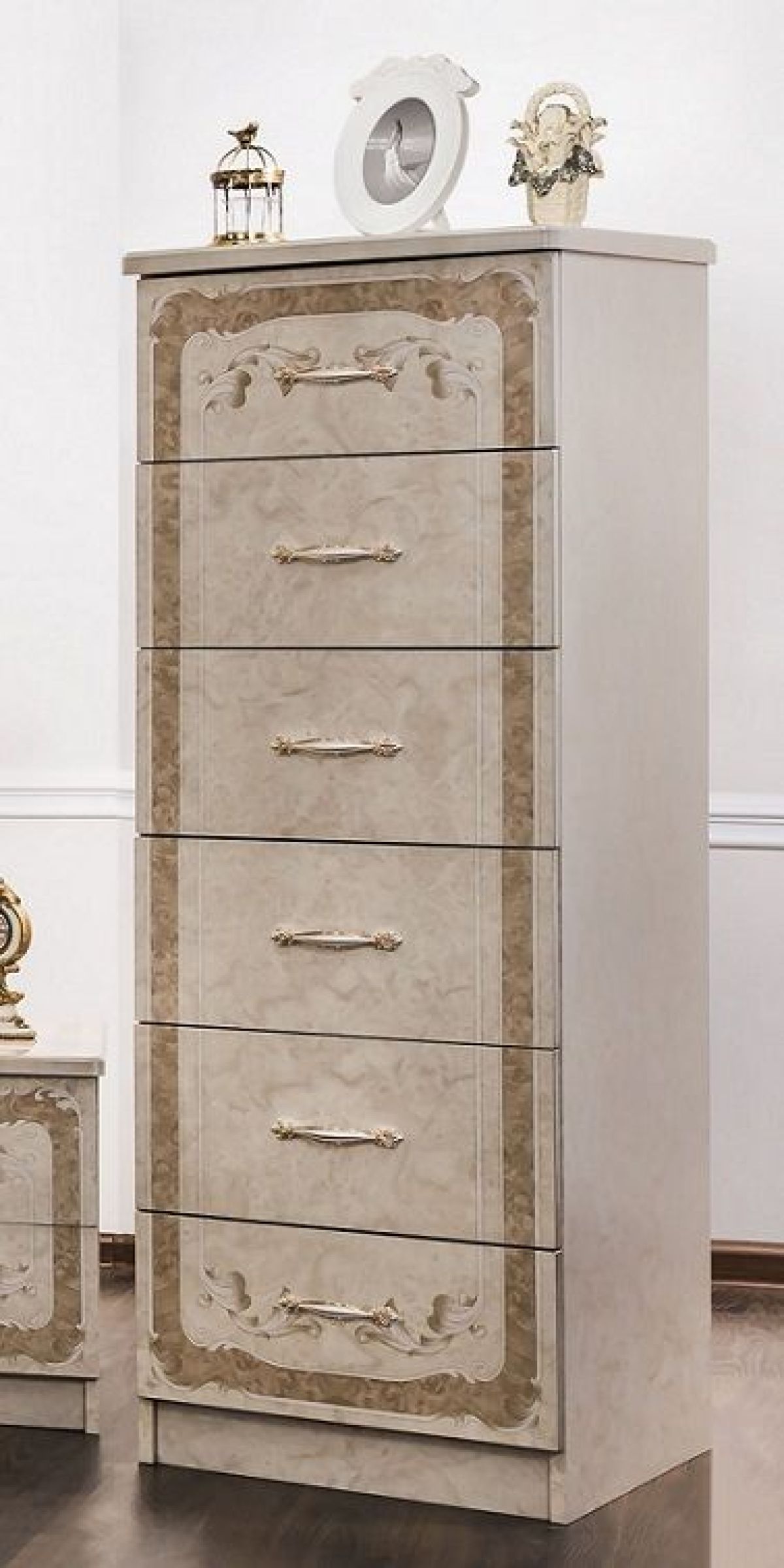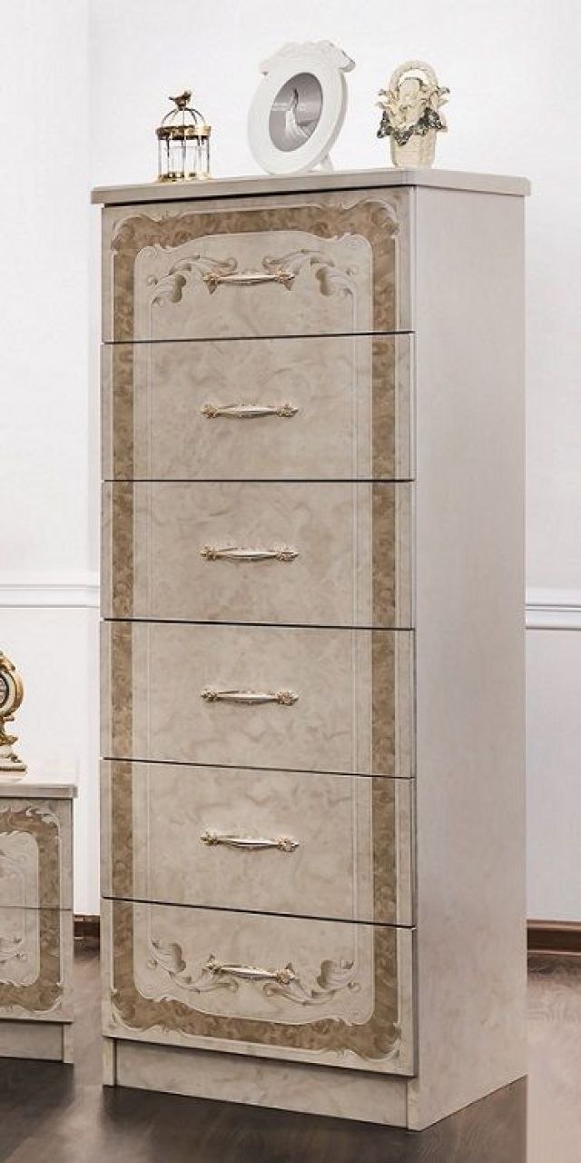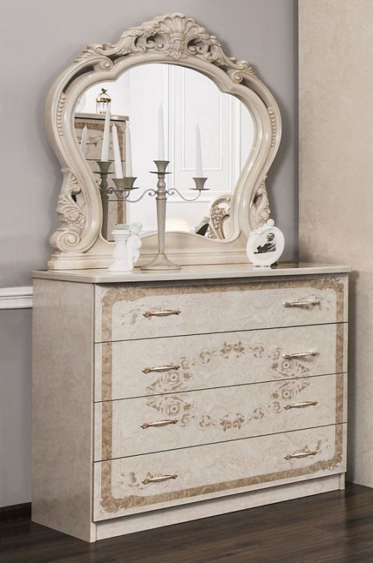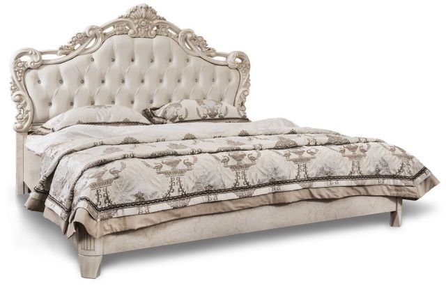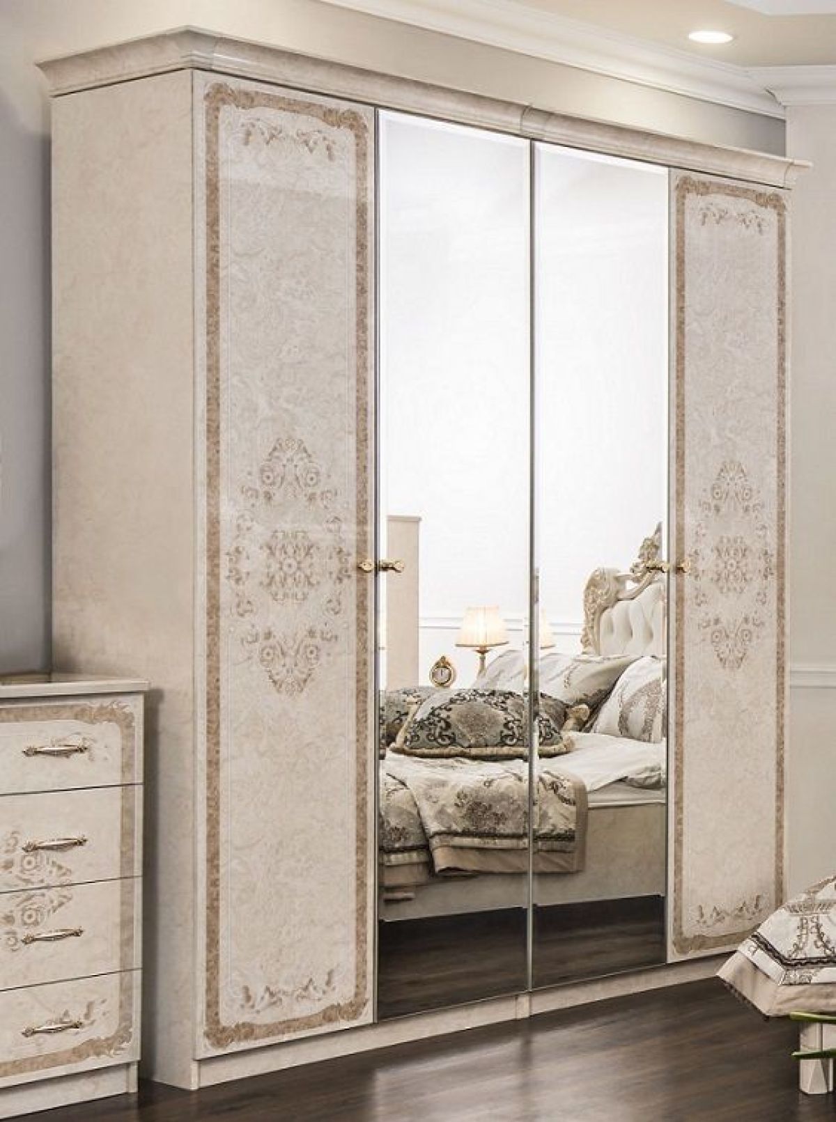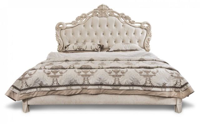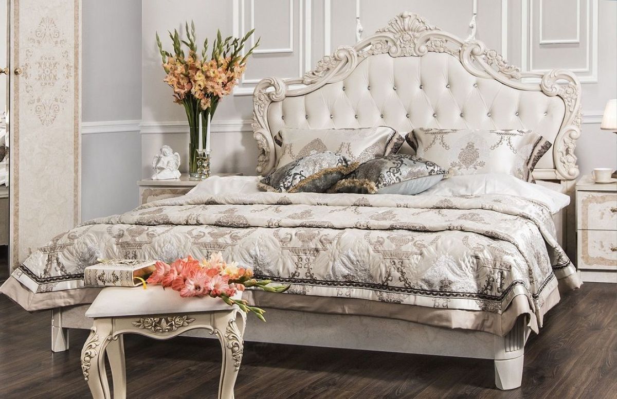 Спальный гарнитур "Патрисия" крем глянец очаровывает с первого взгляда своим дизайном. Спальня создана в традиционном итальянском стиле, кровать имеет ажурную спинку с мягким элементом. Гарнитур не оставит равнодушными ценителей классики в интерьере.