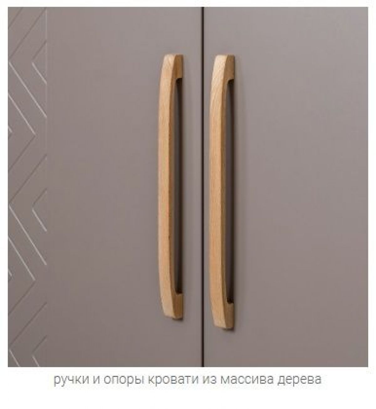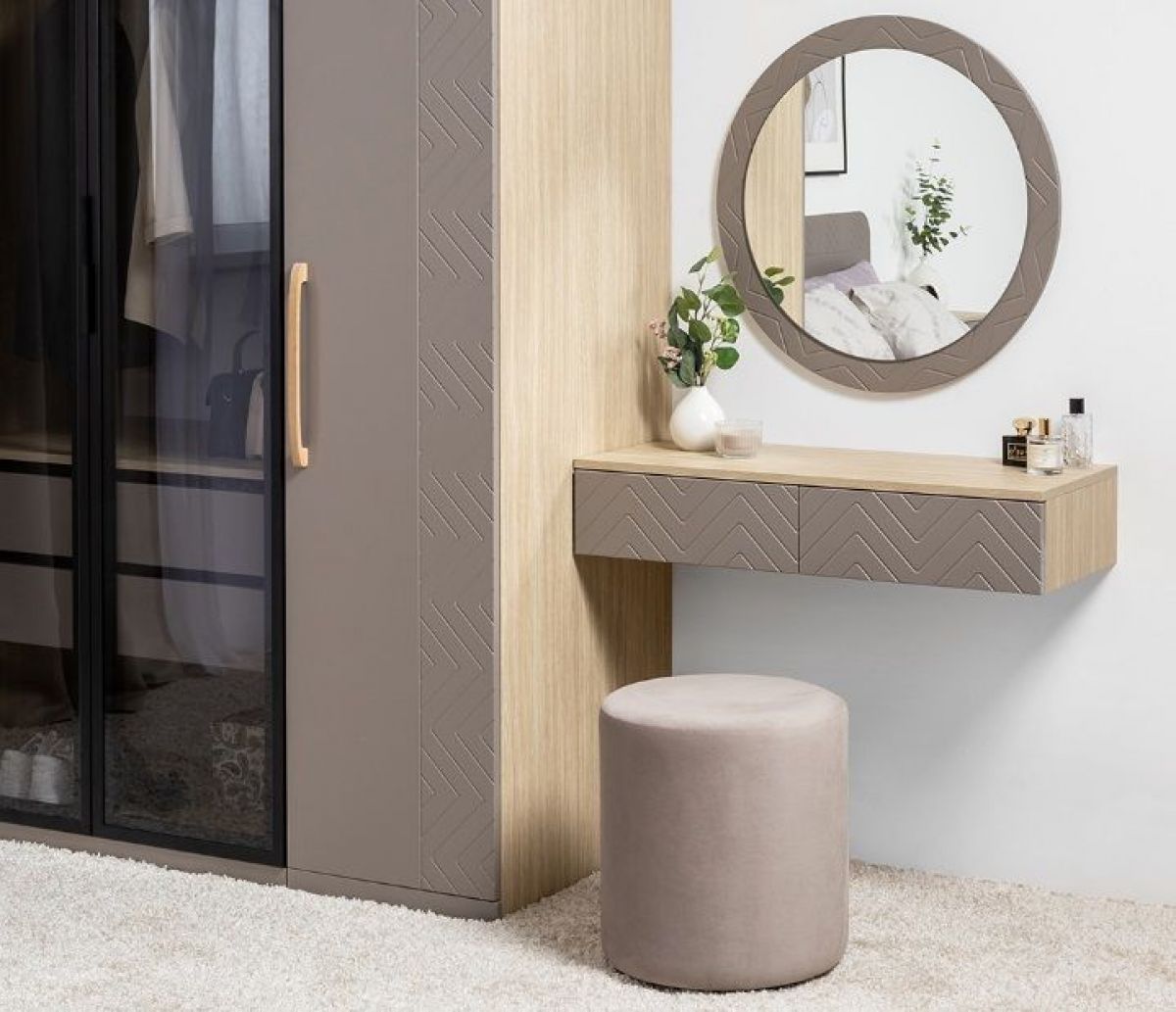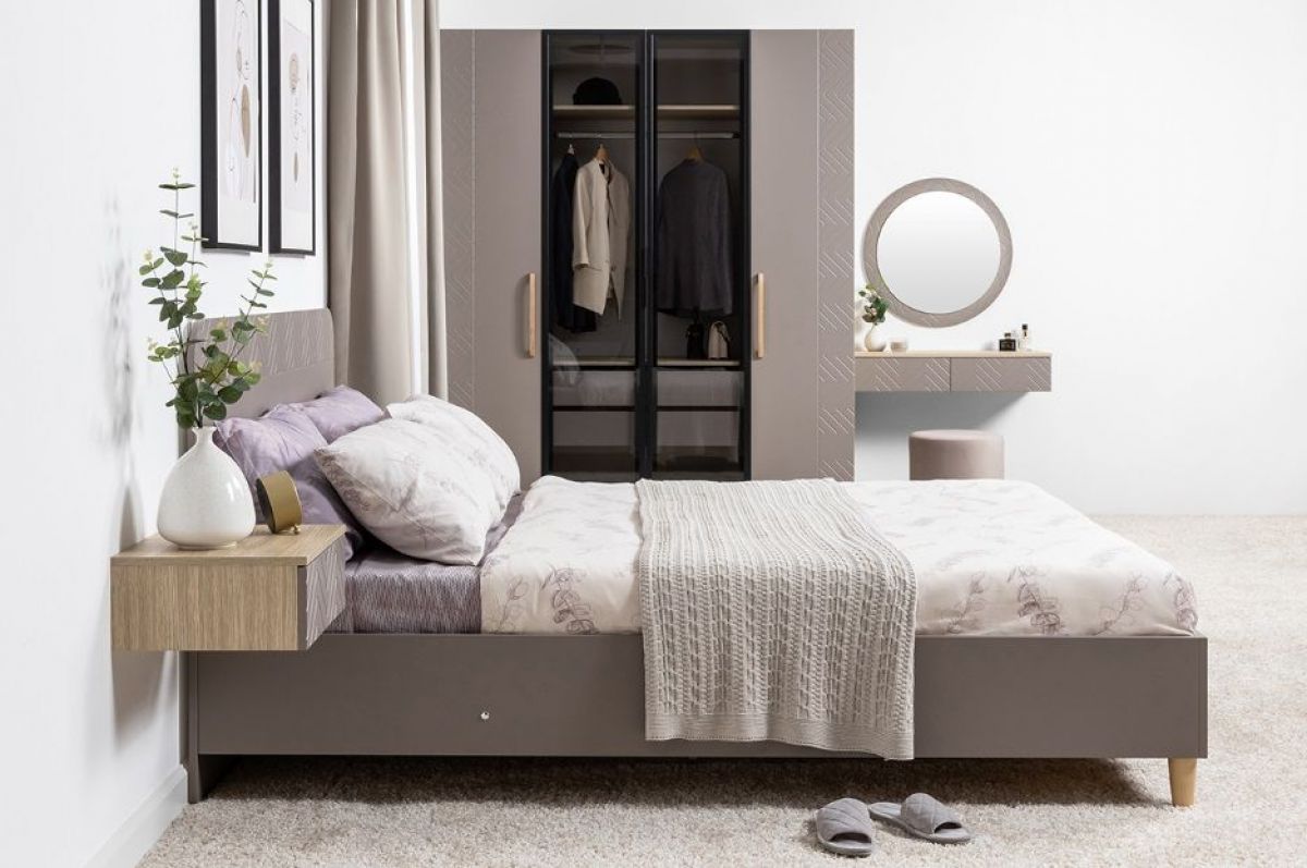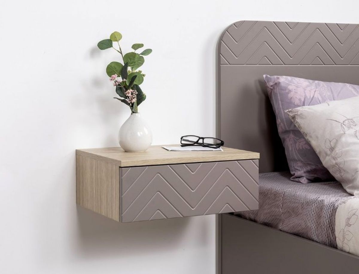 Подвесные консоли и велюровый пуф в тон фасадов дополняют сдержанный и благородный облик спальни Амьен.