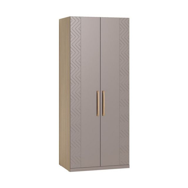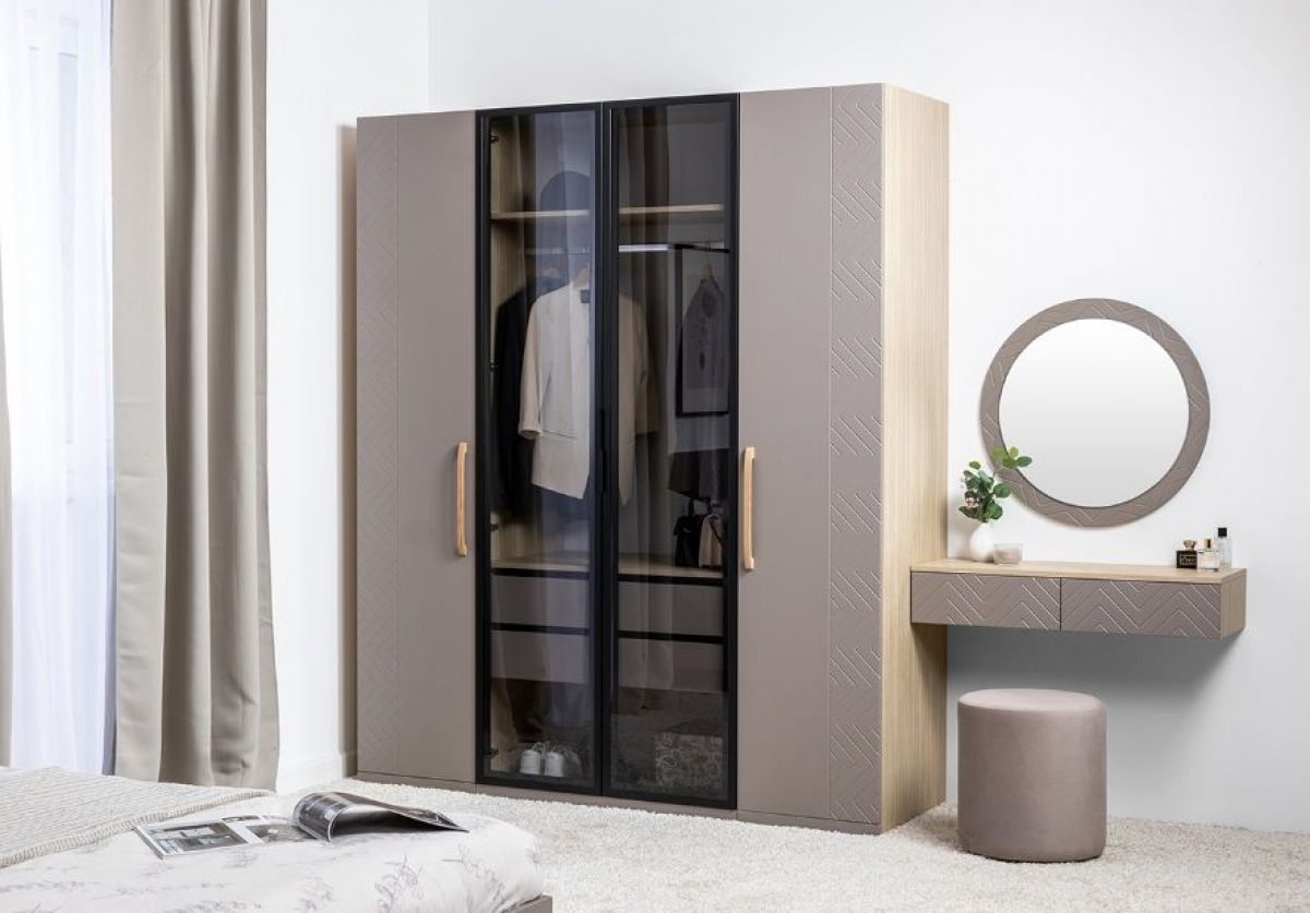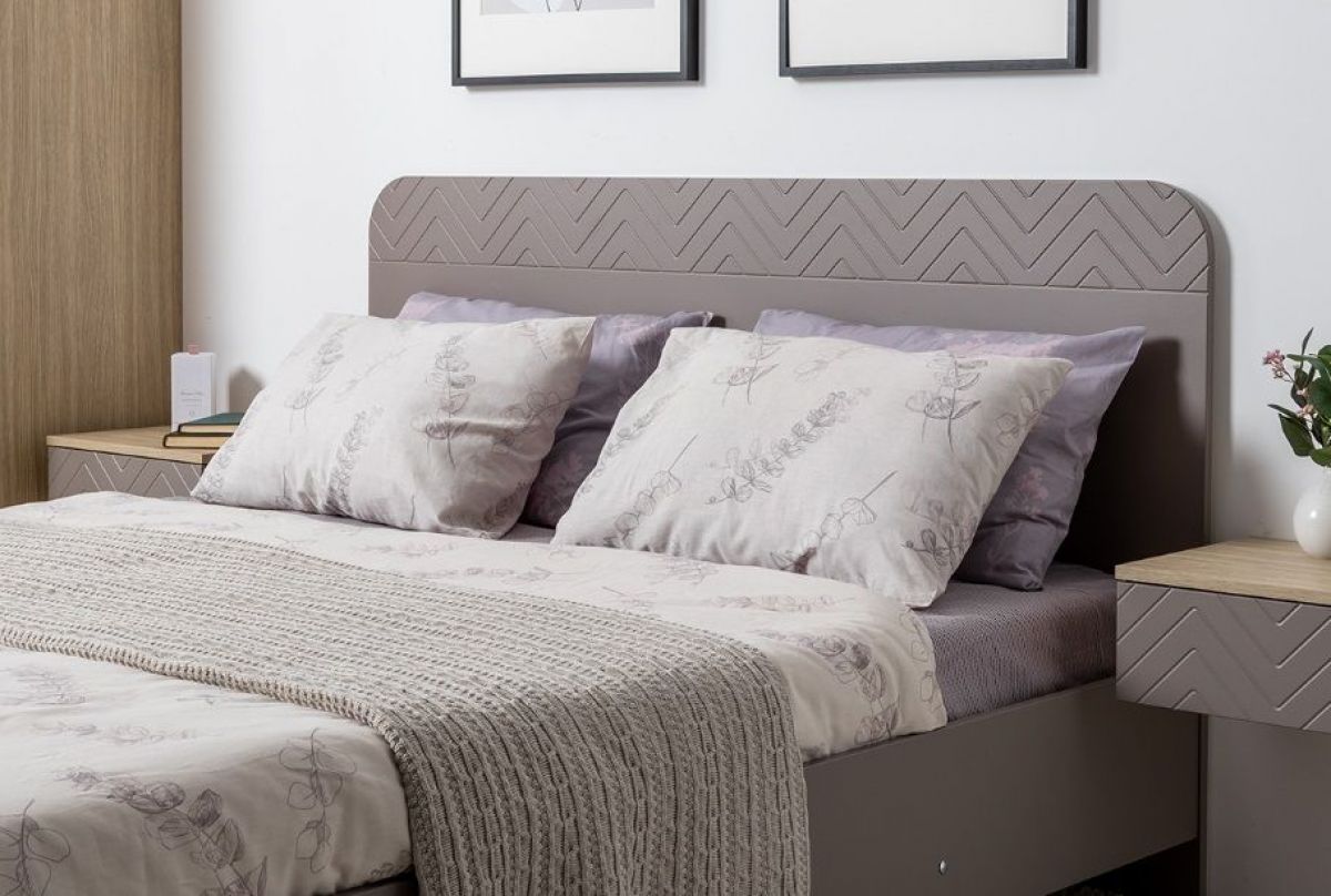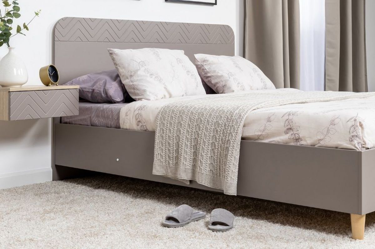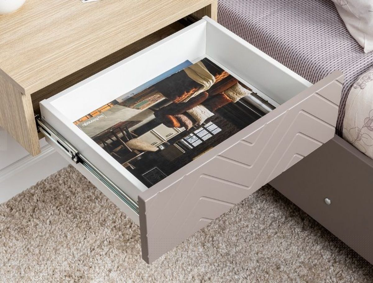 Подвесные консоли и велюровый пуф в тон фасадов дополняют сдержанный и благородный облик спальни Амьен.
