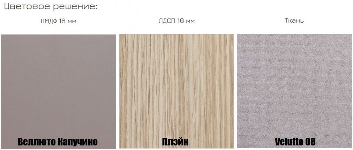 Цветовые решения: Белый PE шагрень, Веллюто Капучино AG 707 ПВХ, Velutto 08 (светлый кварцевый серый), Плэйн.