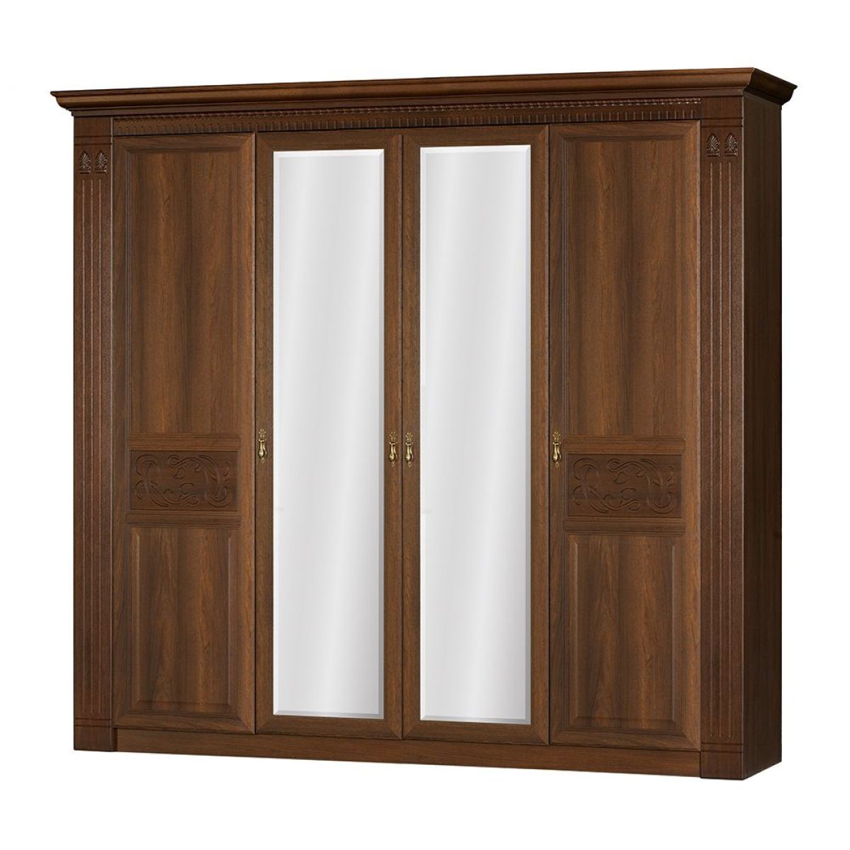 Мебель оснащена надежной немецкой фурнитурой «Hettich, во всех модулях серии «Лючия» устанавлена одинаковая лицевая фурнитура под состаренное золото, поэтому шкафы для одежды и тумбы могут быть использованы для обоих помещений
