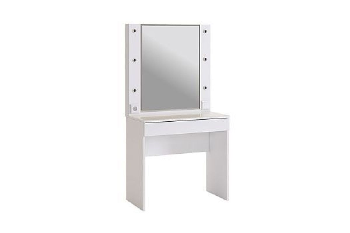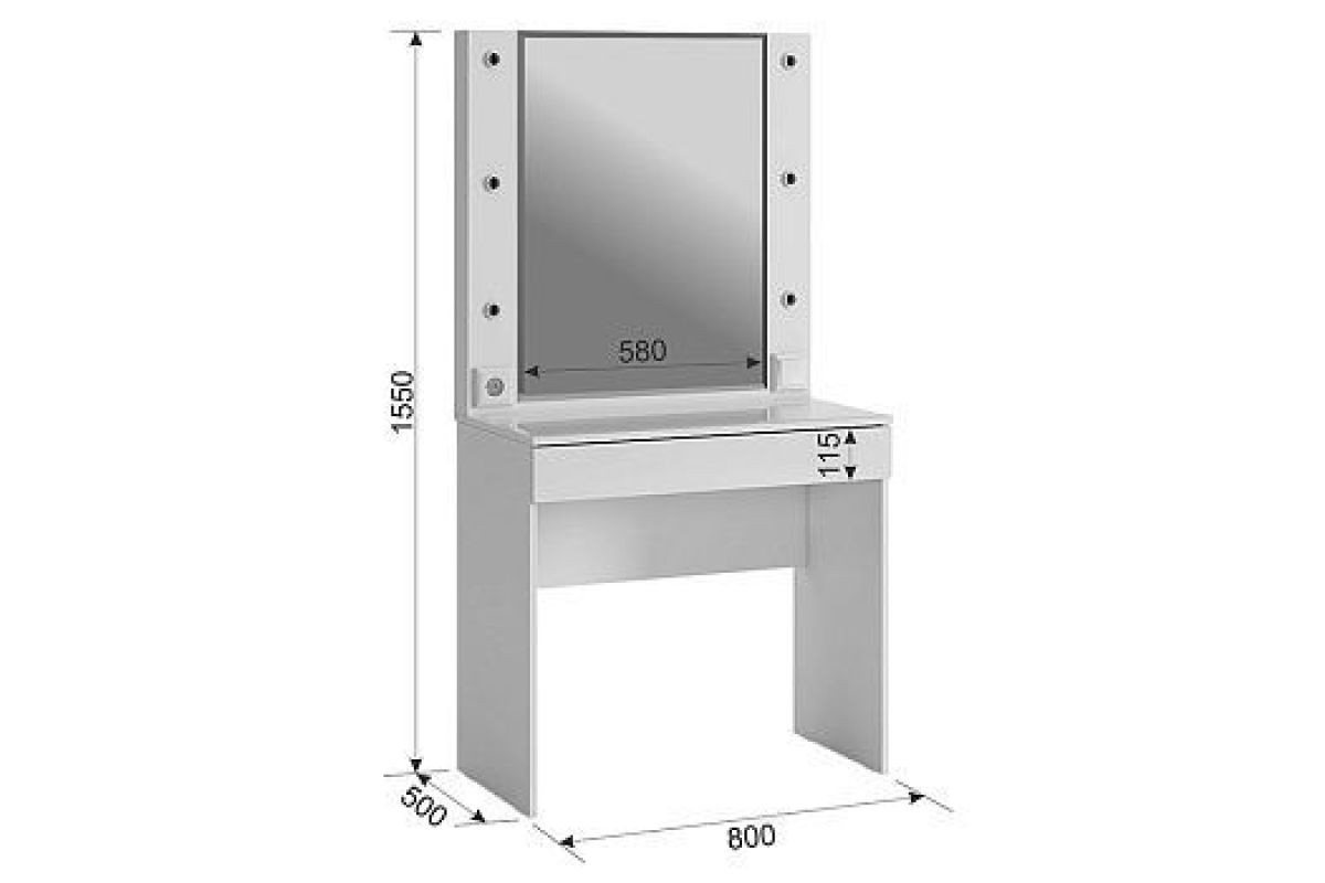 Состоит из: зеркала с подсветкой, встроенного выключателя, розетки для фена, стеклянной столешницы и выдвижного ящика.