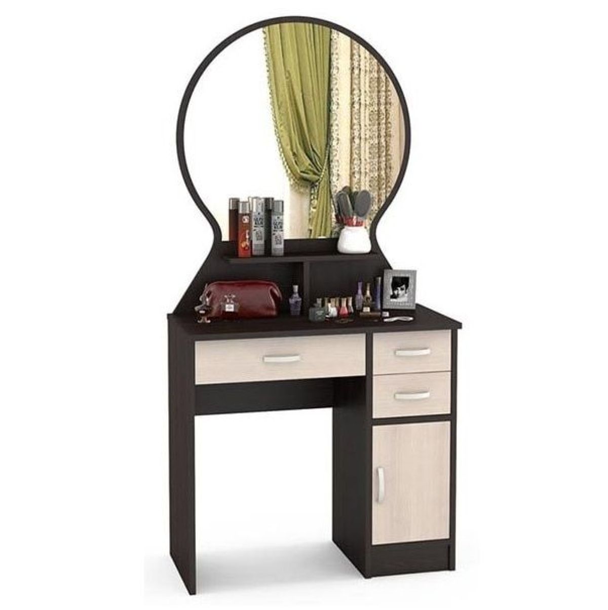 Туалетный стол «Надежда-М04» – эстетичный предмет интерьера, обеспечивающий пользователю комфортные условия для поддержания ухоженного внешнего вида. Круглое зеркало гармонично вписывается в общую конструкцию. Три выдвижных ящика и боковая секция с распашными створками предоставляют возможность хранения большого количества косметики, предметов ухода за лицом и средств гигиены. Под зеркалом установлена полка для расположения изящных вещей. Свободная ниша слева обеспечивает удобное размещение человека в положении сидя.