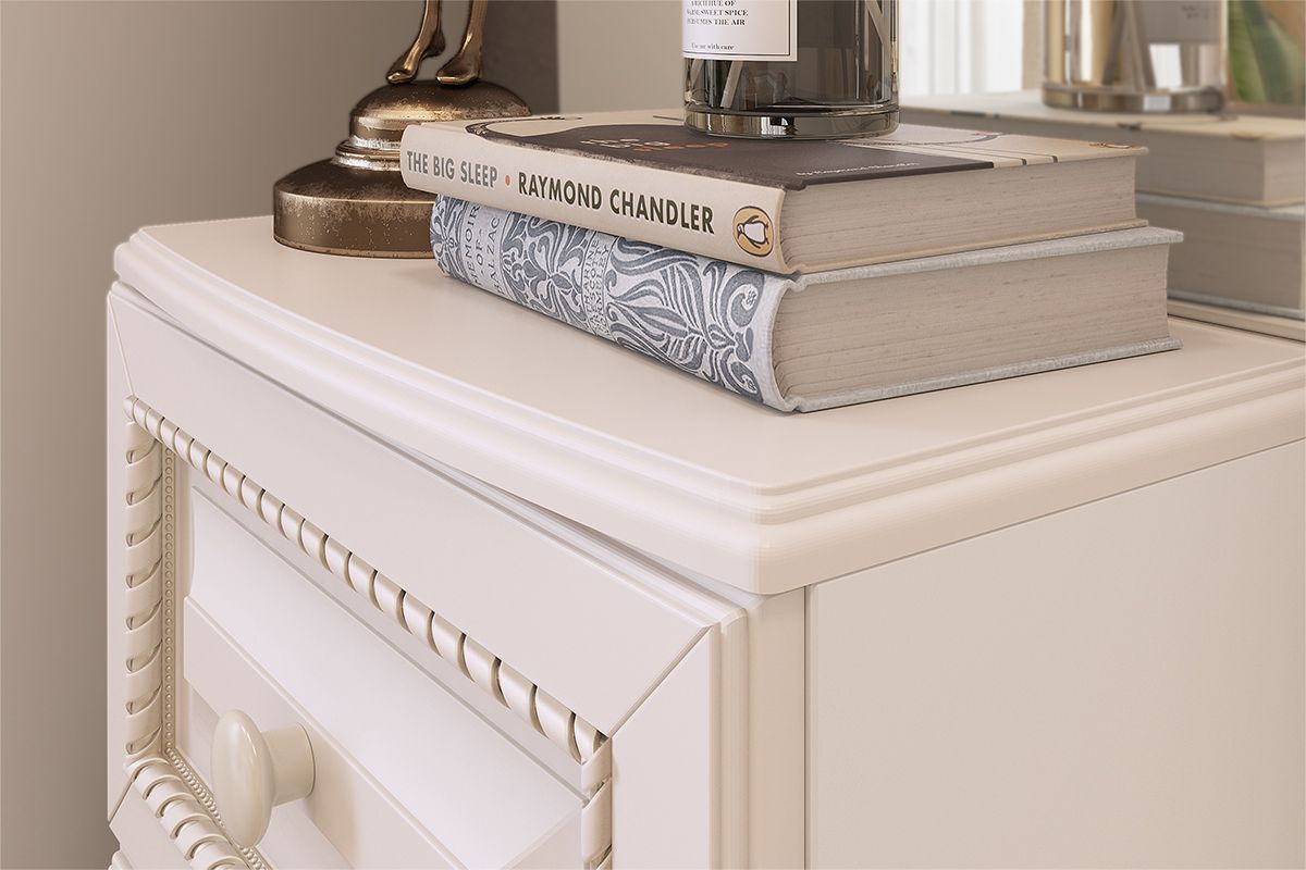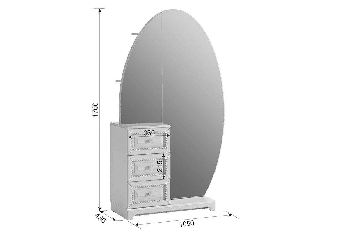 Состоит из: 3-х выдвижных ящиков, зеркала, стеллажа с полками, расположенный за зеркалом.