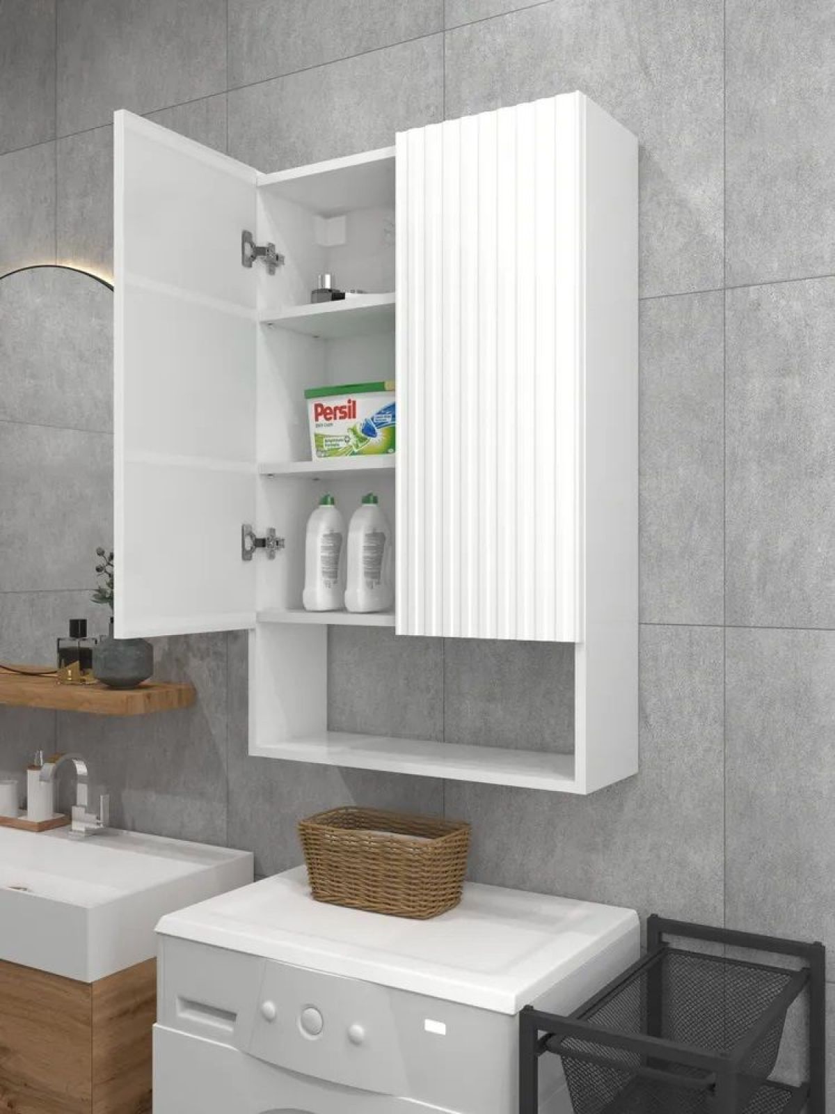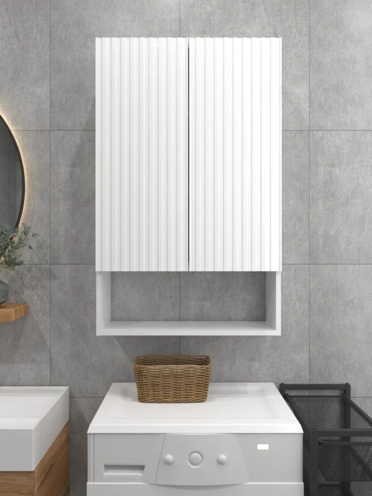 Белый шкаф с рифлёным фасадом будет отлично и стильно смотреться как в ванной, так и в туалете.
