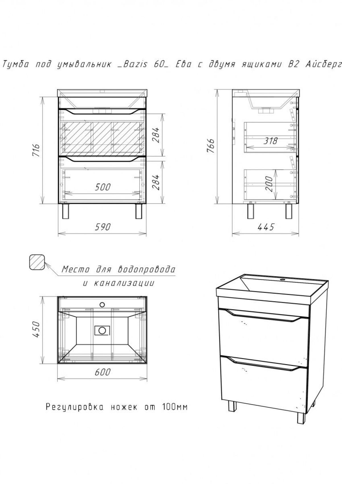Тумба под умывальник "UNIT 60" Ева с двумя ящиками В2 Айсберг (DA5911T)
