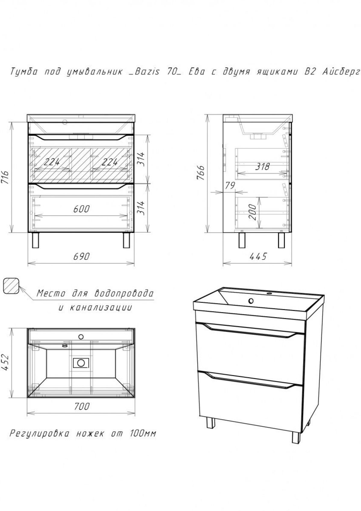 Тумба под умывальник "UNIT 70" Ева с двумя ящиками В2 Айсберг (DA5907T)