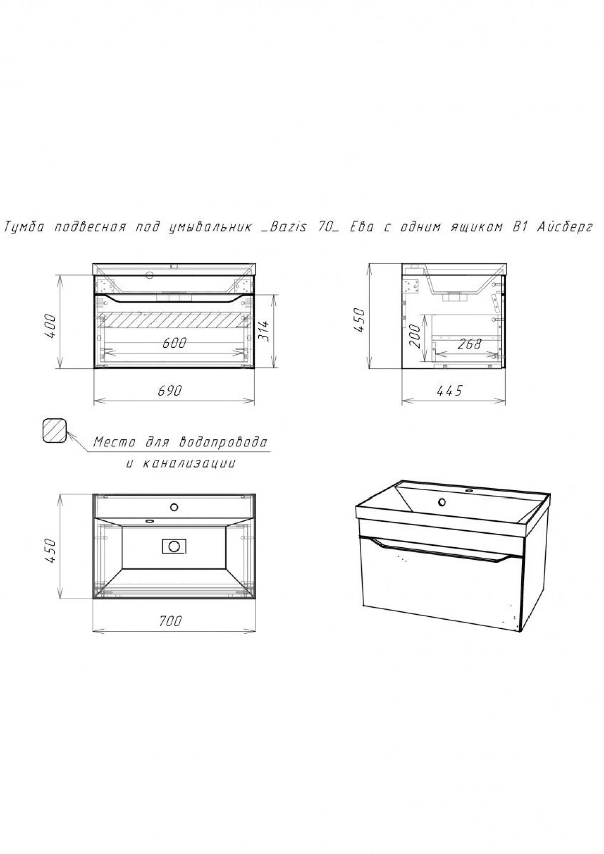 Тумба подвесная под умывальник "UNIT 70" Ева с одним ящиком В1 Айсберг (DA5902T)
