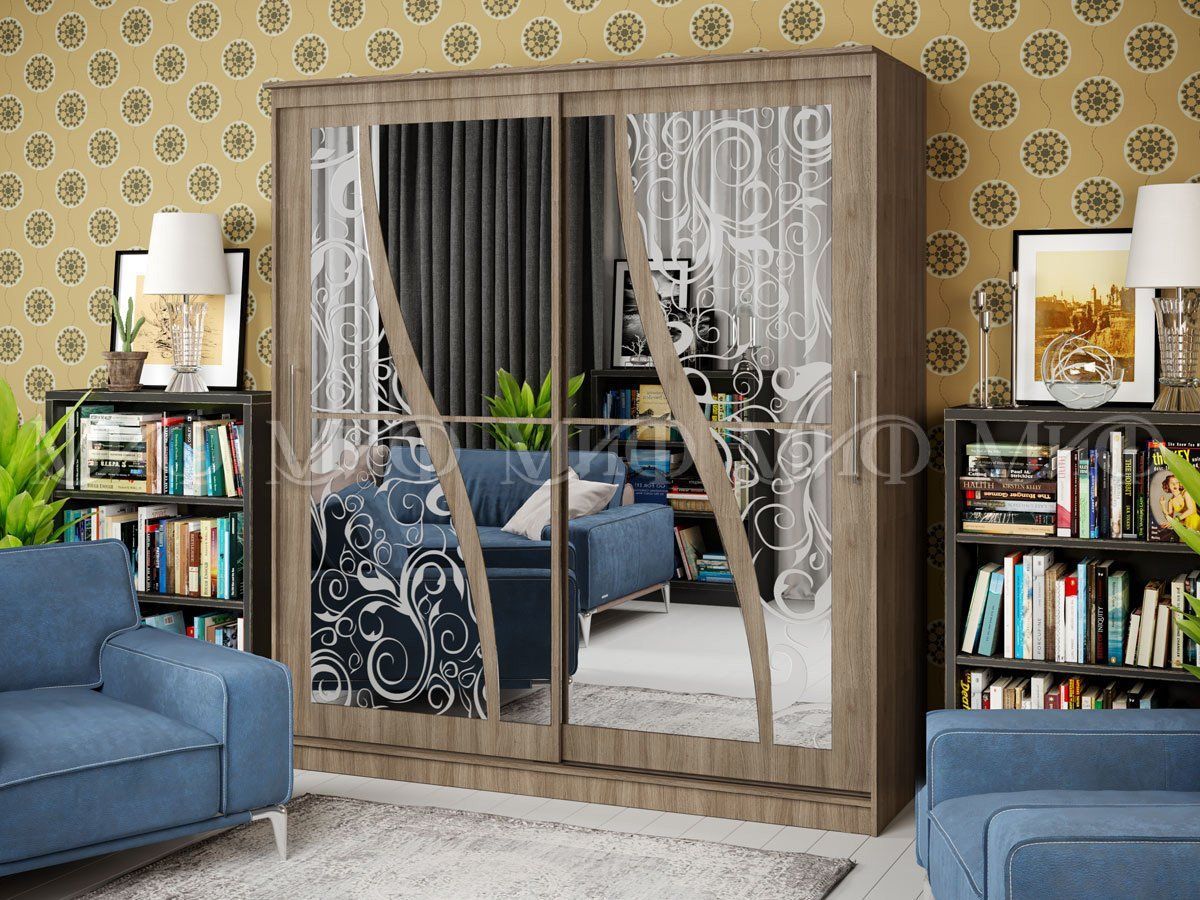 Достойное решение для современного интерьера. Обычный шкаф-купе за счет уникального дизайна приобретает новую эстетику. Большие зеркала декорированы пескоструйным рисунком.
