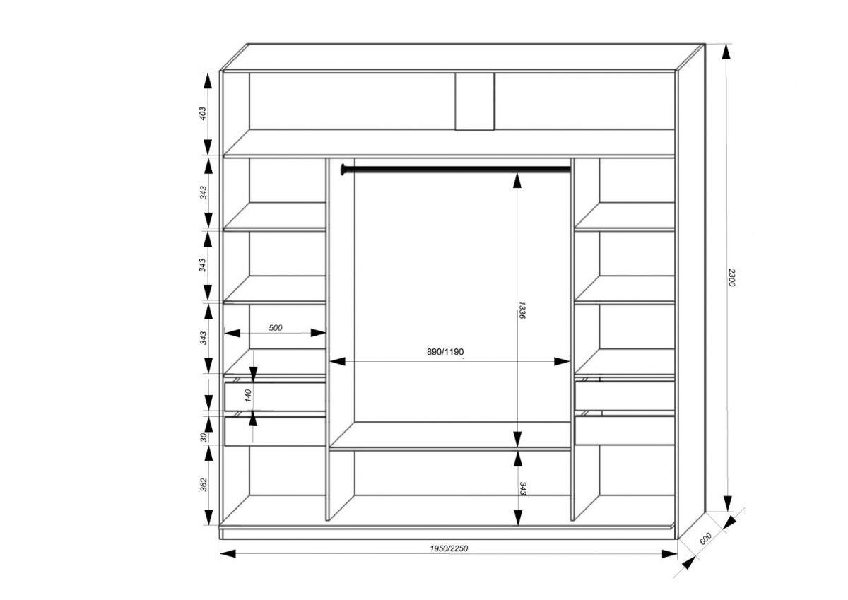 Шкаф-купе 1950 серии SILVER S3+S1+S3Z B22+PL2 (по 2 ящика лев/прав+1штанга+1 полка) профиль «Серебро»