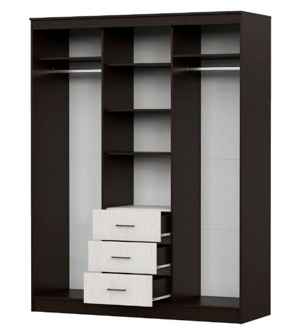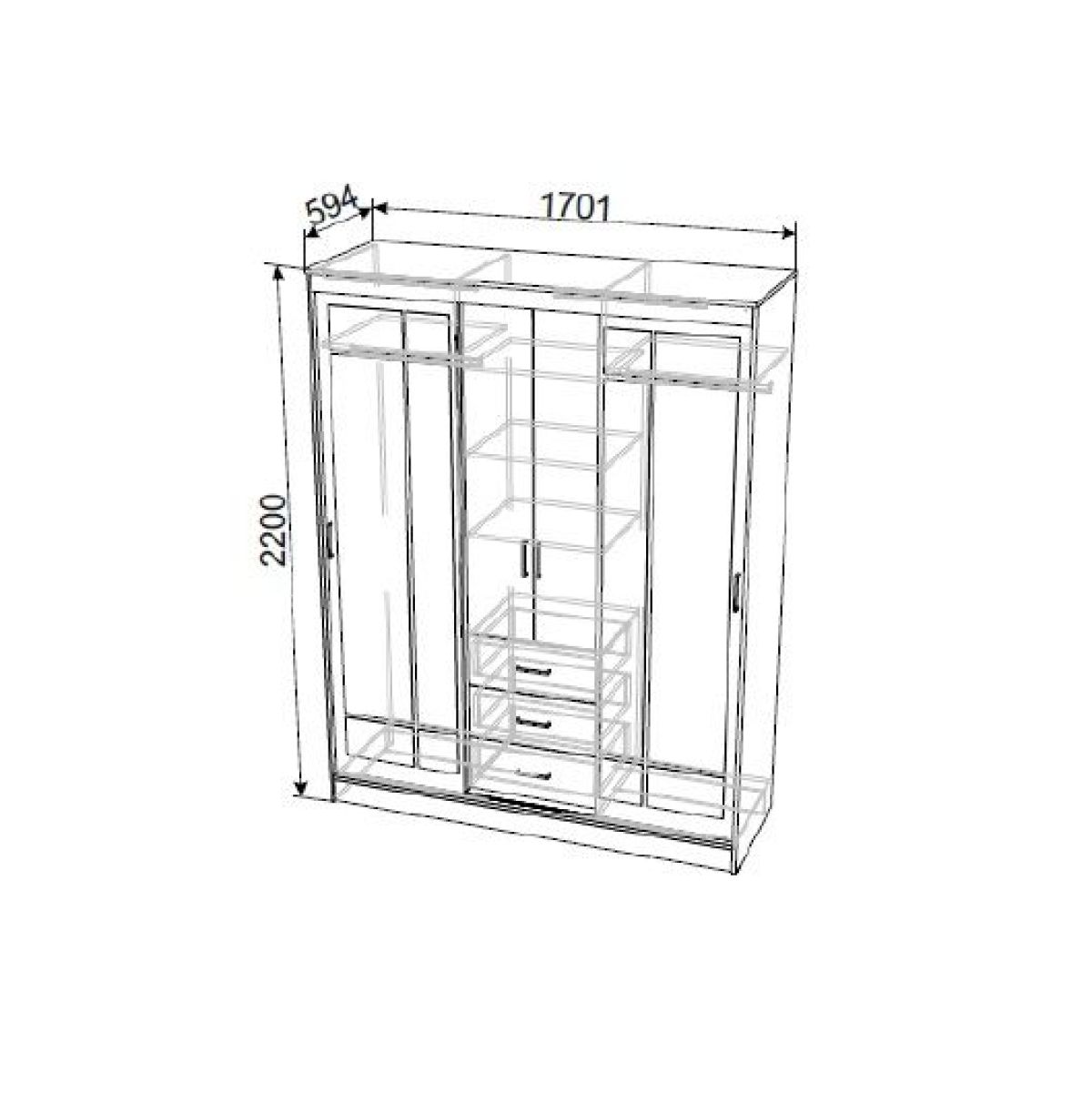 Изделие представляет собой комбинированный шкаф-купе. По краям шкафа располагаются платяные отделения с раздвижными створками, укомплектованные одной верхней полкой и металлической штангой. Посередине располагается бельевое отделение, которое состоит из двух секций. Верхняя секция с двумя распашными створками комплектуется тремя полками. В нижней секции находятся три выдвижных ящика. Раздвижные створки шкафа комплектуются декором из зеркал с фацетом. Декор приклеивается к створке на фабрике.