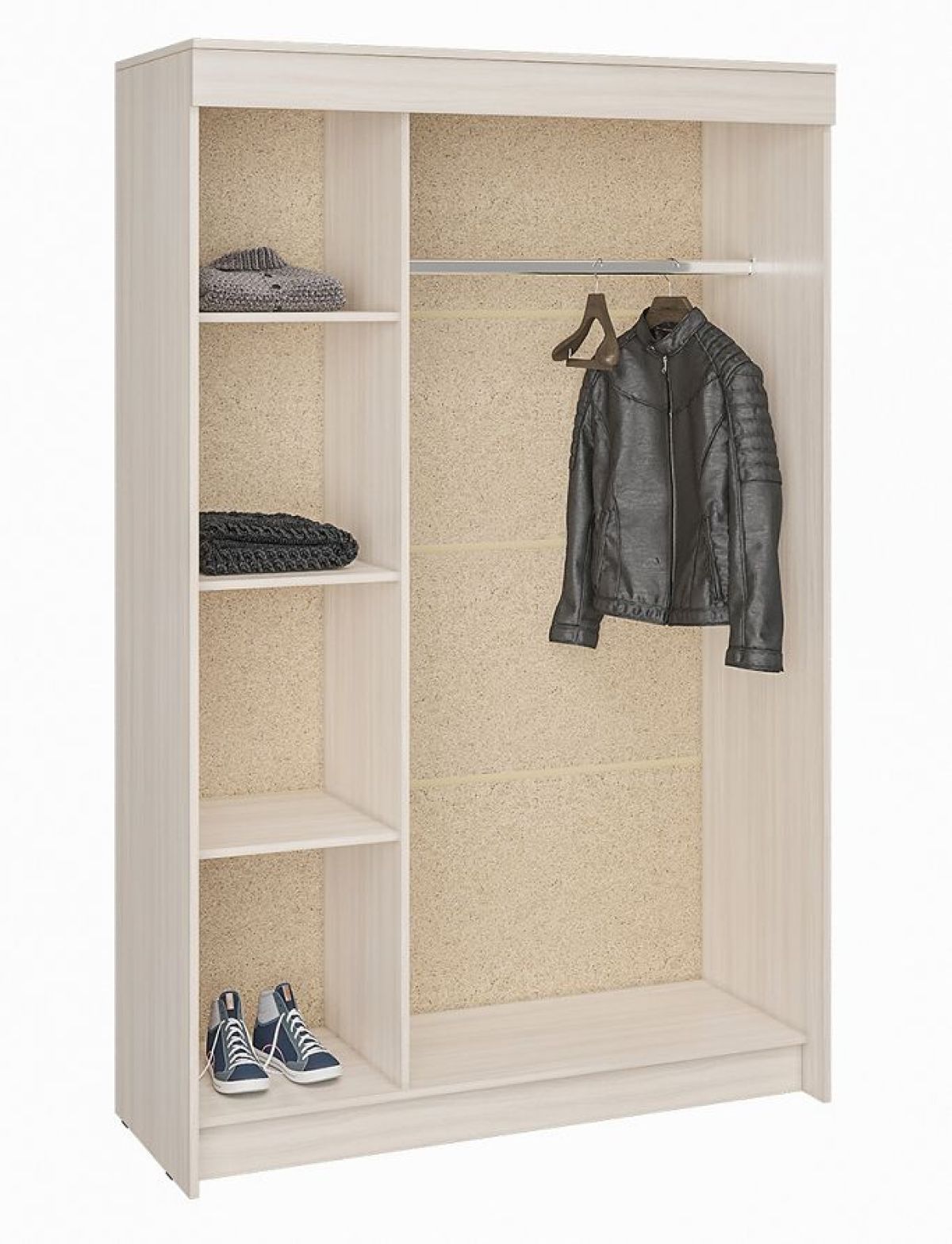 В левой части шкаф оборудован несколькими полочками для хранения белья. В правой расположена надёжная штанга для размещения одежды на плечиках.