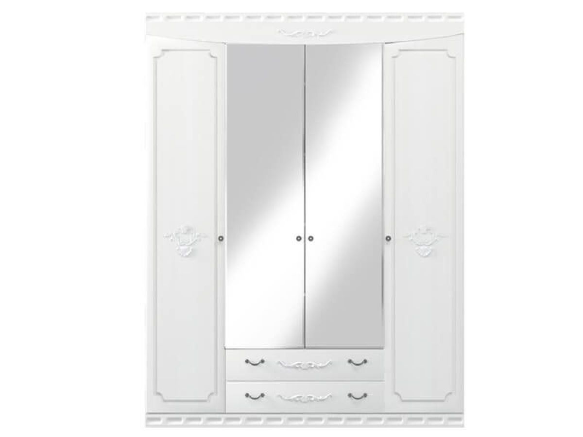 Вместительный шкаф имеет 4 створки и два выдвижных ящика на шариковых направляющих: внутри есть полки для одежды и штанга.