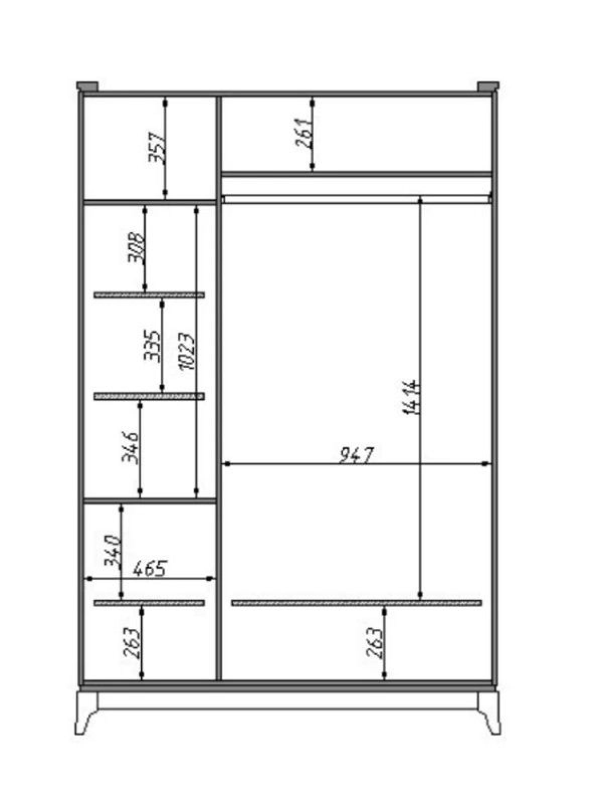 Внутри слева 5 полок для хранения вещей, справа - штанга для вешалок.