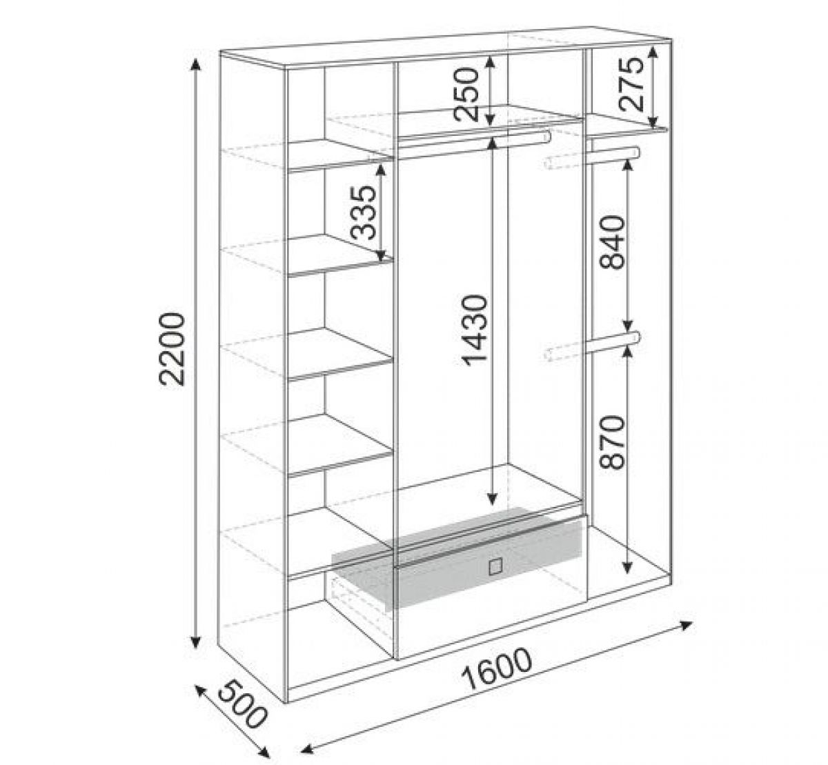 4. Шкаф имеет два отделения со штангами для длинных и коротких вещей; 2 ящика с разделителями по середине и секцию с 5 полками.